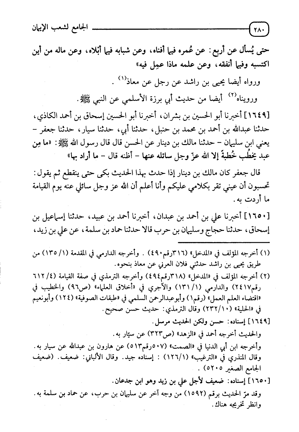 1649 - أَخْبَرَنَا أَبُو الْحُسَيْنِ بْنُ بِشْرانَ، أخبرنا أَبُو الْحُسَيْنِ إِِسْحَاقُ بْنُ أَحْمَدَ الْكَاذِيُّ، حدثنا عَبْدُ اللهِ بْنُ أَحْمَدَ بْنِ مُحَمَّدِ بْنِ حَنْبَلٍ، حدثنا أَبِي، حدثنا سَيَّارٌ، حدثنا جَعْفَرُ بْنُ سُلَيْمَانَ، حدثنا مَالِكُ بْنُ دِينَارٍ، عَنِ الْحَسَنِ، قَالَ: قَالَ رَسُولُ اللهِ صَلَّى اللَّهُ عَلَيْهِ وَسَلَّمَ: §" مَا مِنْ عَبْدٍ يَخْطُبُ خُطْبَةً إِلَّا اللهُ عَزَّ وَجَلَّ سَائِلُهُ عَنْهَا أظنه قال مَا أَرَادَ بِهَا " قَالَ جَعْفَرٌ: " كَانَ مَالِكُ بْنُ دِينَارٍ إِِذَا حَدَّثَ بِهَذَا الْحَدِيثَ بَكَى حَتَّى يَنْقَطِعَ، ثُمَّ يَقُولُ: تحْسَبُونَ أَنَّ عَيْنِي تَقَرُّ بِكَلَامِي عَلَيْكُمْ، وَأَنَا أَعْلَمُ أَنَّ اللهَ عَزَّ وَجَلَّ سَائِلِي عَنْهُ يَوْمَ الْقِيَامَةِ مَا أَرَدْتُ بِهِ "