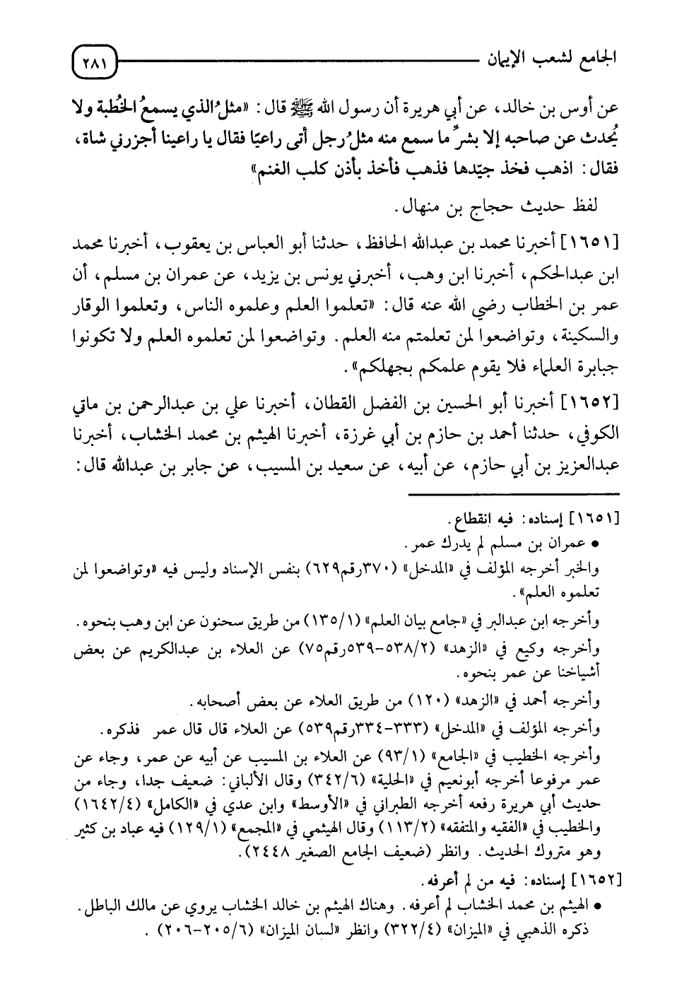 1651 - أَخْبَرَنَا مُحَمَّدُ بْنُ عَبْدِ اللهِ الْحَافِظُ، حدثنا أَبُو الْعَبَّاسِ بْنُ يَعْقُوبَ، أخبرنا مُحَمَّدُ بْنُ عَبْدِ الْحَكَمِ، أخبرنا ابْنُ وَهْبٍ، أَخْبَرَنِي يُونُسُ بْنُ يَزِيدَ، عَنْ عِمْرَانَ بْنِ مُسْلِمٍ، أَنَّ عُمَرَ بْنَ الْخَطَّابِ رَضِيَ اللهُ عَنْهُ، قَالَ: " §تَعَلَّمُوا الْعِلْمَ وَعَلِّمُوهُ النَّاسَ، وَتَعَلَّمُوا الْوَقَارَ وَالسَّكِينَةَ، وَتَوَاضَعُوا لِمَنْ تَعَلَّمْتُمْ مِنْهُ الْعِلْمَ، وَتَوَاضَعُوا لِمَنْ تُعَلِّمُوهُ الْعِلْمَ، وَلَا تَكُونُوا جَبَابِرَةَ الْعُلَمَاءِ فَلَا يَقُومُ عِلْمُكُمْ بِجَهْلِكُمْ "