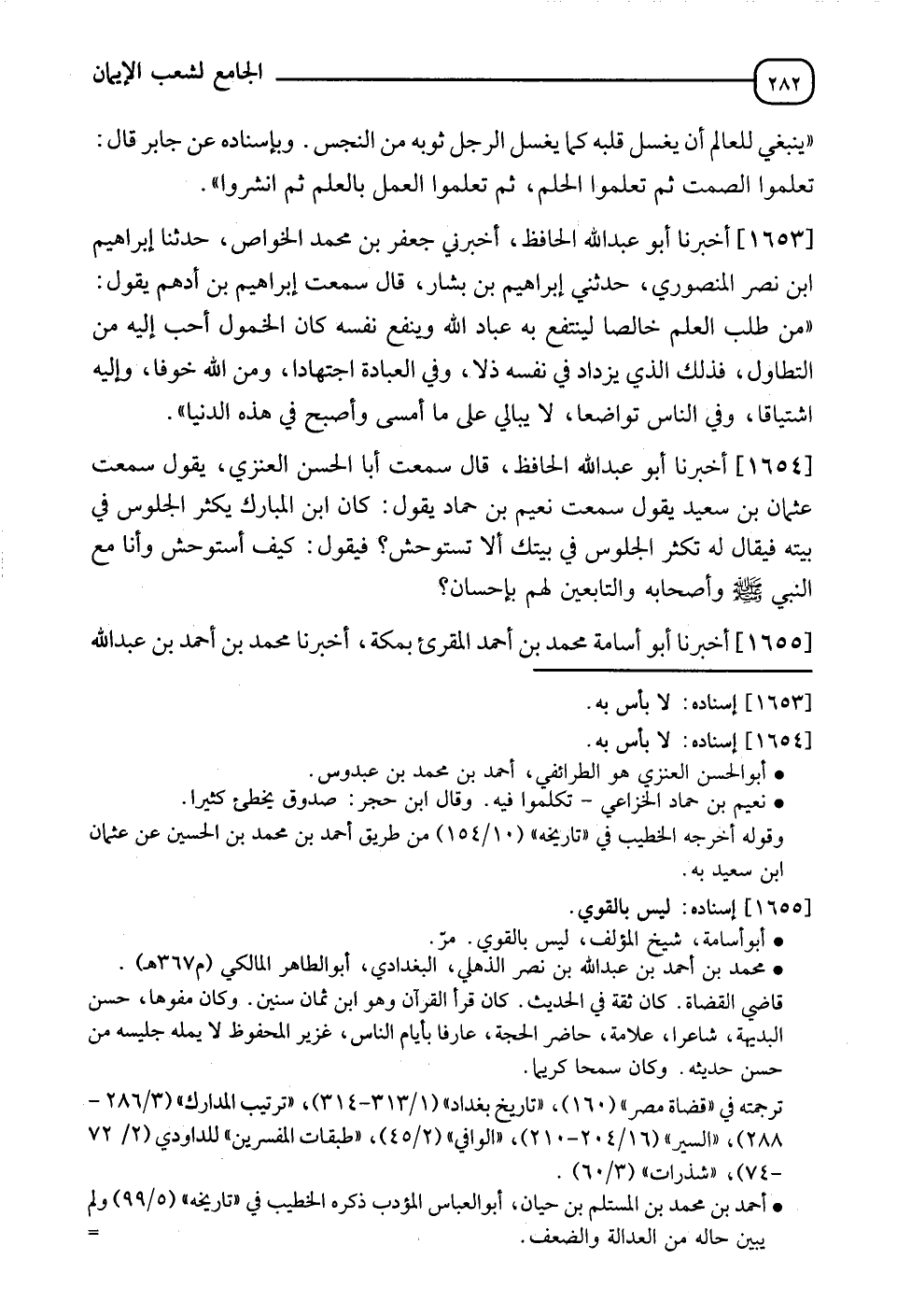 1654 - أَخْبَرَنَا أَبُو عَبْدِ اللهِ الْحَافِظُ قَالَ: سَمِعْتُ أَبَا الْحَسَنِ الْعَنَزِيَّ يَقُولُ: سَمِعْتُ عُثْمَانَ بْنَ سَعِيدٍ يَقُولُ: سَمِعْتُ نُعَيْمُ بْنُ حَمَّادٍ يَقُولُ: كَانَ ابْنُ الْمُبَارَكِ يُكْثِرُ الْجُلُوسَ فِي بَيْتِهِ، فَيُقَالُ لَهُ: تُكْثِرُ الْجُلُوسَ فِي بَيْتِكَ، أَلَا تَسْتَوْحِشُ؟ فَيَقُولُ: " §كَيْفَ أَسْتَوْحِشُ، وَأَنَا مَعَ النَّبِيِّ صَلَّى اللَّهُ عَلَيْهِ وَسَلَّمَ وَأَصْحَابِهِ وَالتَّابِعِينَ لَهُمْ بِإِحْسَانٍ؟ "