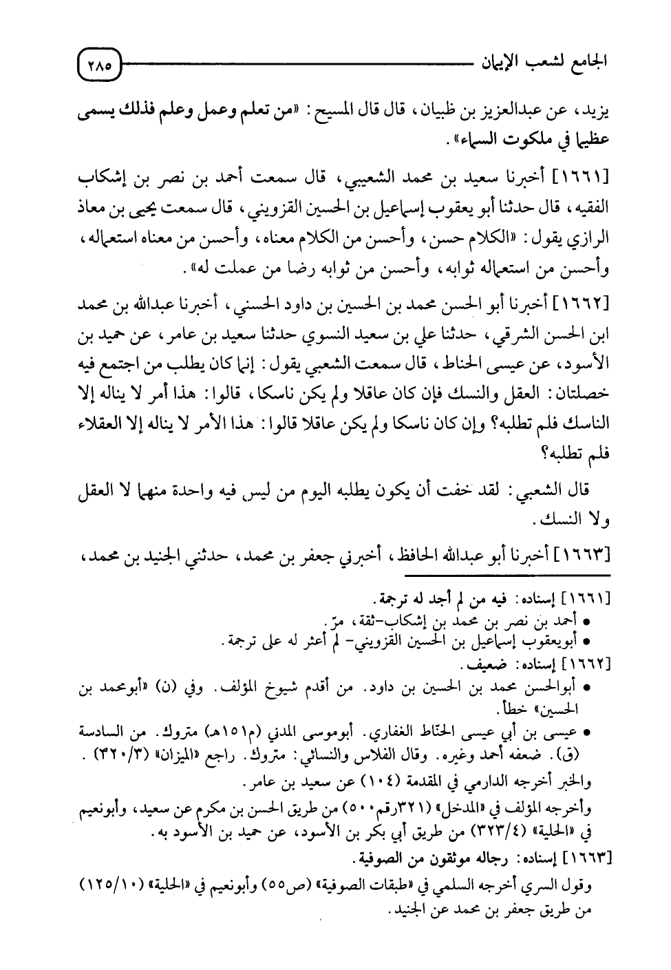 1662 - أَخْبَرَنَا أَبُو الحسن مُحَمَّدِ بْنُ الْحُسَيْنِ بْنِ دَاوُدَ الْحَسَنِيُّ، أخبرنا عَبْدُ اللهِ بْنُ مُحَمَّدِ بْنِ الْحَسَنِ الشَّرْقِيُّ، حدثنا عَلِيُّ بْنُ سَعِيدٍ النَّسَوِيُّ، حدثنا سَعِيدُ بْنُ عَامِرٍ، عَنْ حُمَيْدِ بْنِ الْأَسْوَدِ، عَنْ عِيسَى الْحَنَّاطِ، قَالَ: سَمِعْتُ الشَّعْبِيَّ يَقُولُ: " إِنَّمَا كَانَ §يَطْلُبُ مَنِ اجْتَمَعَ فِيهِ خَصْلَتَانِ: الْعَقْلُ وَالنُّسُكُ، فَإنْ كَانَ عَاقِلًا، وَلَمْ يَكُنْ نَاسِكًا؟ " قَالُوا: هَذَا أَمْرٌ لَا يَنَالُهُ إِلَّا النَّاسِكُ فَلِمَ تَطْلُبُهُ؟ " وَإِنْ كَانَ نَاسِكًا، وَلَمْ يَكُنْ عَاقِلًا؟ " قَالُوا: هَذَا الْأَمْرُ لَا يَنَالُهُ إِلَّا الْعُقَلَاءُ، فَلِمَ تَطْلُبُهُ؟ قَالَ الشَّعْبِيُّ: " لَقَدْ خِفْتُ أَنْ يَكُونَ يَطْلُبُهُ الْيَوْمَ مَنْ لَيْسَ فِيهِ وَاحِدَةٌ مِنْهُمَا لَا الْعَقْلُ وَلَا النُّسُكُ "