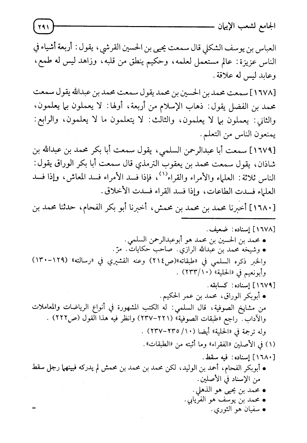 1679 - سَمِعْتُ أَبَا عَبْدِ الرَّحْمَنِ السُّلَمِيَّ يَقُولُ: سَمِعْتُ أَبَا بَكْرٍ مُحَمَّدَ بْنَ مُحَمَّدِ عبد الله بْنِ شَاذَانَ يَقُولُ: سَمِعْتُ مُحَمَّدَ بْنَ يَعْقُوبَ التِّرْمِذِيَّ قَالَ: سَمِعْتُ أَبَا بَكْرٍ الْوَرَّاقَ يَقُولُ: " §النَّاسُ ثَلَاثَةٌ: الْعُلَمَاءُ، وَالْأُمَرَاءُ، وَالْقُرَّاءُ، فَإِذَا فَسَدَ الْأُمَرَاءُ فَسَدَ الْمَعَاشُ، وَإِذَا فَسَدَ الْعُلَمَاءُ فَسَدَتِ الطَّاعَاتُ، وَإِذَا فَسَدَتِ الْقَرَّاءُ فَسَدَتِ الْأَخْلَاقُ "