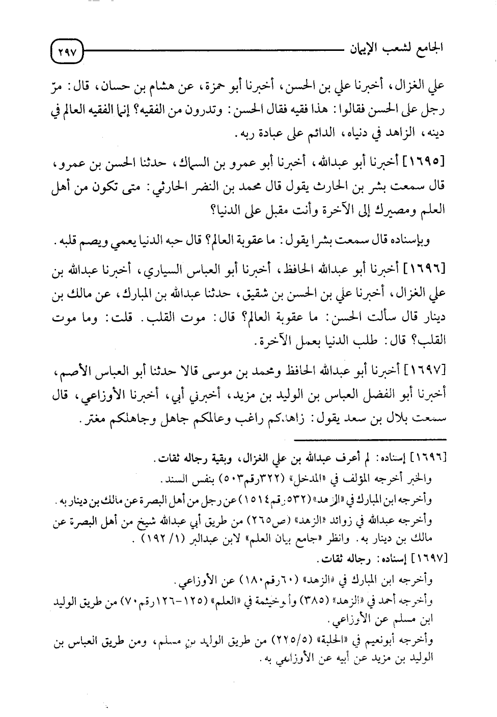 1697 - أَخْبَرَنَا أَبُو عَبْدِ اللهِ الْحَافِظُ، وَمُحَمَّدُ بْنُ مُوسَى قَالَا: حدثنا أَبُو الْعَبَّاسِ الْأَصَمُّ، أخبرنا أَبُو الْفَضْلِ الْعَبَّاسُ بْنُ الْوَلِيدِ بْنِ مَزْيَدٍ، أَخْبَرَنِي أَبِي، أخبرنا الْأَوْزَاعِيُّ قَالَ: سَمِعْتُ بِلَالَ بْنَ سَعْدٍ يَقُولُ: " §زَاهِدُكُمْ رَاغِبٌ، وَعَالِمُكْمُ جَاهِلٌ، وَجَاهِلُكُمْ مُغْتَرٌّ "