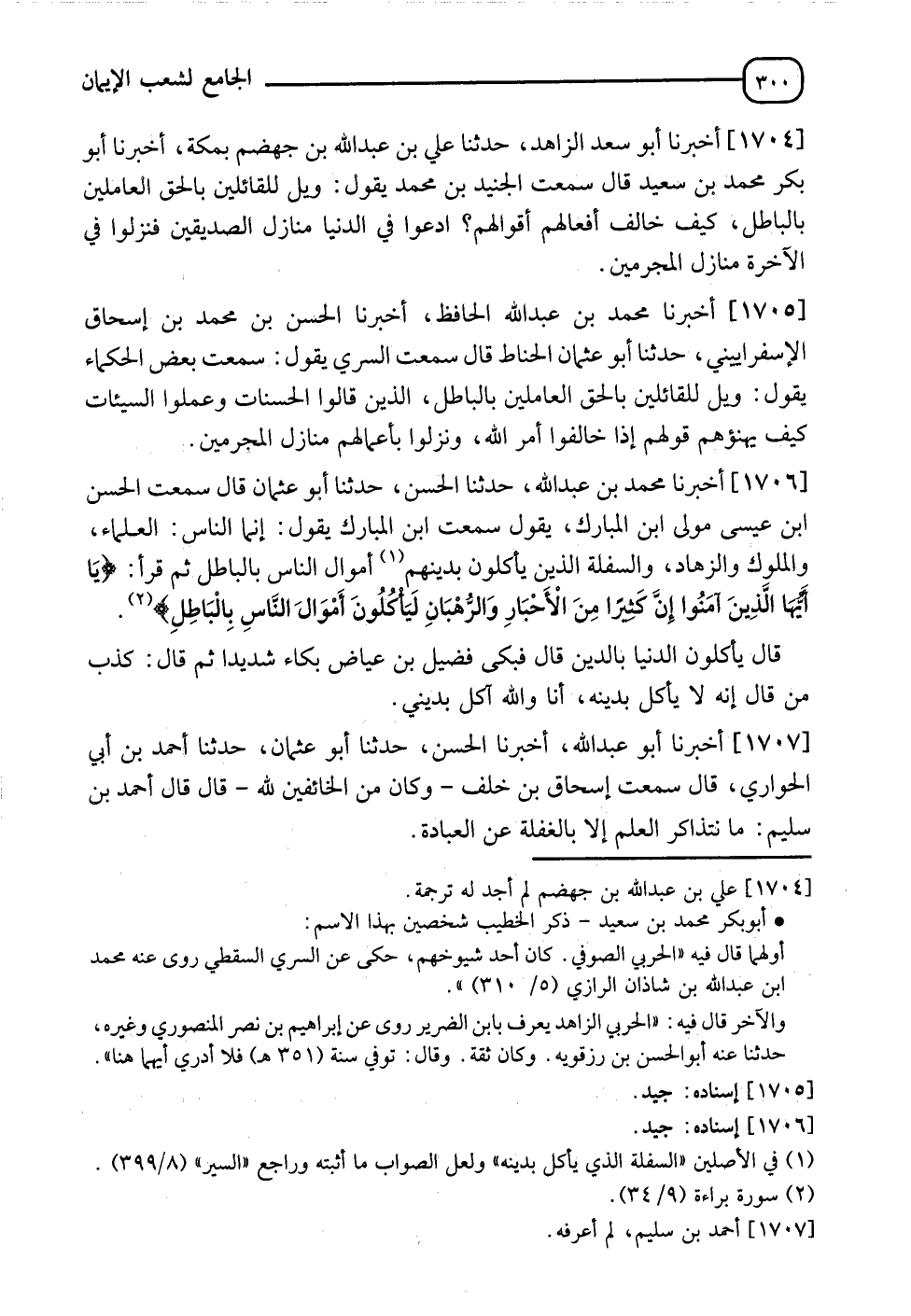 1704 - أَخْبَرَنَا أَبُو سَعْدٍ الزَّاهِدُ، حدثنا عَلِيُّ بْنُ عَبْدِ اللهِ بْنِ جَهْضَمٍ بِمَكَّةَ، أَخْبَرَنَا أَبُو بَكْرٍ مُحَمَّدُ بْنُ سَعِيدٍ قَالَ: سَمِعْتُ الْجُنَيْدَ بْنَ مُحَمَّدٍ، يَقُولُ: " §وَيْلٌ لِلْقَائِلِينَ بِالْحَقِّ الْعَامِلِينَ بِالْبَاطِلِ، كَيْفَ خَالَفَ أَفْعَالُهُمْ أَقْوَالَهُمْ، ادَّعَوْا فِي الدُّنْيَا مَنَازِلَ الصِّدِّيقِينَ، فَنَزَلُوا فِي الْآخِرَةِ مَنَازِلَ الْمُجْرِمِينَ "