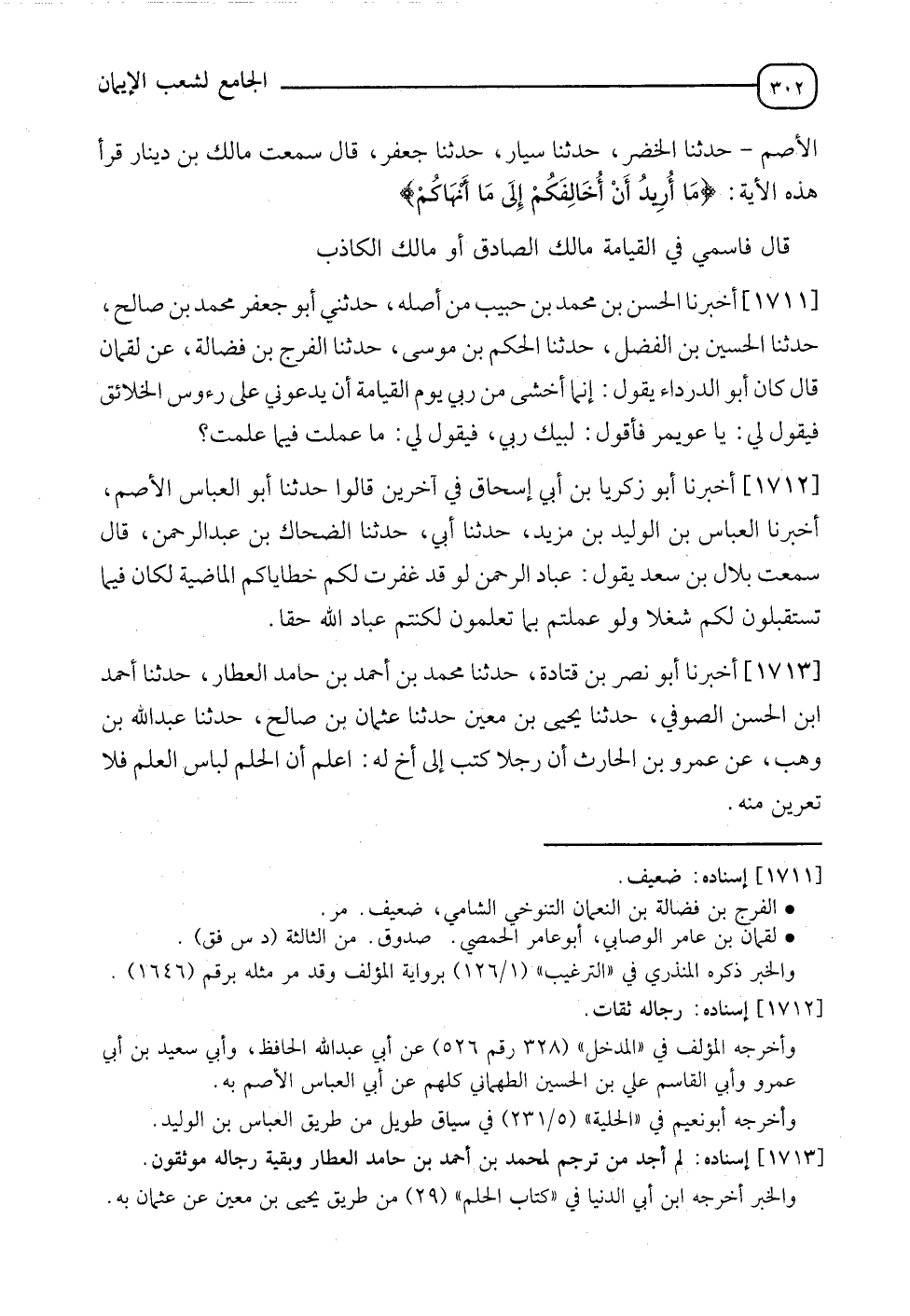 1711 - أَخْبَرَنَا الْحَسَنُ بْنُ مُحَمَّدِ بْنِ حَبِيبٍ مِنْ أَصْلِهِ حَدَّثَنِي أَبُو جَعْفَرٍ مُحَمَّدُ بْنُ صَالِحٍ، حدثنا الْحُسَيْنُ بْنُ الْفَضْلِ، حدثنا الْحَكَمُ بْنُ مُوسَى، حدثنا الْفَرَجُ بْنُ فَضَالَةَ، عَنْ لُقْمَانَ قَالَ: كَانَ أَبُو الدَّرْدَاءِ يَقُولُ: " إِنَّمَا §أَخْشَى مِنْ رَبِّي يَوْمَ الْقِيَامَةِ أَنْ يَدْعُوَنِي عَلَى رُؤوسِ الْخَلَائِقِ، فَيَقُولُ لِي: يَا عُوَيْمِرُ، فَأَقُولُ: لَبَّيْكَ رَبِّي، فَيَقُولُ لِي: مَا عَمِلْتَ فِيمَا عَلِمْتَ؟ "