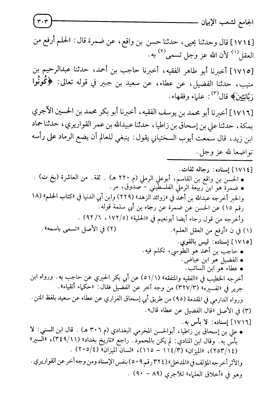 1714 - قَالَ: وَحَدَّثَنَا يَحْيَى، حدثنا حَسَنُ بْنُ واقِعٍ، عَنْ ضَمْرَةَ قَالَ: §" الْحِلْمُ أَرْفَعُ مِنَ الْعَقْلِ؛ لِأَنَّ اللهَ عَزَّ جَلَّ تَسَمَّى بِهِ "
