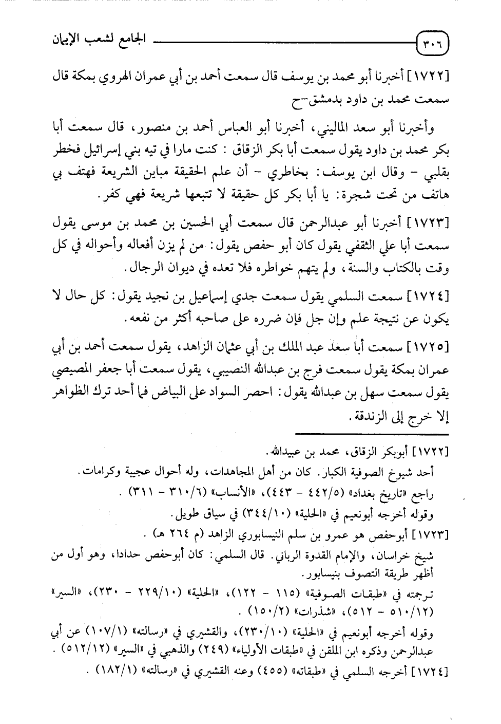 1722 - أَخْبَرَنَا أَبُو مُحَمَّدِ بْنُ يُوسُفَ قَالَ: سَمِعْتُ أَحْمَدَ بْنَ أَبِي عِمْرَانَ الْهَرَوِيَّ بِمَكَّةَ قَالَ: سَمِعْتُ مُحَمَّدَ بْنَ دَاوُدَ بِدِمَشْقَ، ح وَأَخْبَرَنَا أَبُو سَعْدٍ الْمَالِينِيُّ، أخبرنا أَبُو الْعَبَّاسِ أَحْمَدُ بْنُ مَنْصُورٍ قَالَ: سَمِعْتُ أَبَا بَكْرٍ مُحَمَّدَ بْنَ دَاوُدَ يَقُولُ: سَمِعْتُ أَبَا بَكْرٍ الزَقَّاقَ يَقُولُ: " كُنْتُ مَارًّا فِي تِيهِ بَنِي إِسْرَائِيلَ فَخَطَرَ بِقَلْبِي - وَقَالَ ابْنُ يُوسُفَ بِخَاطِرِي - أَنَّ عِلْمَ الْحَقِيقَةِ مُبَايِنٌ الشَّرِيعَةَ، فَهَتَفَ بِي هَاتِفٌ مِنْ تَحْتِ شَجَرَةٍ، يَا أَبَا بَكْرٍ، §كُلُّ حَقِيقَةٍ لَا تَتْبَعُهَا شَرِيعَةٌ فَهِيَ كُفْرٌ "