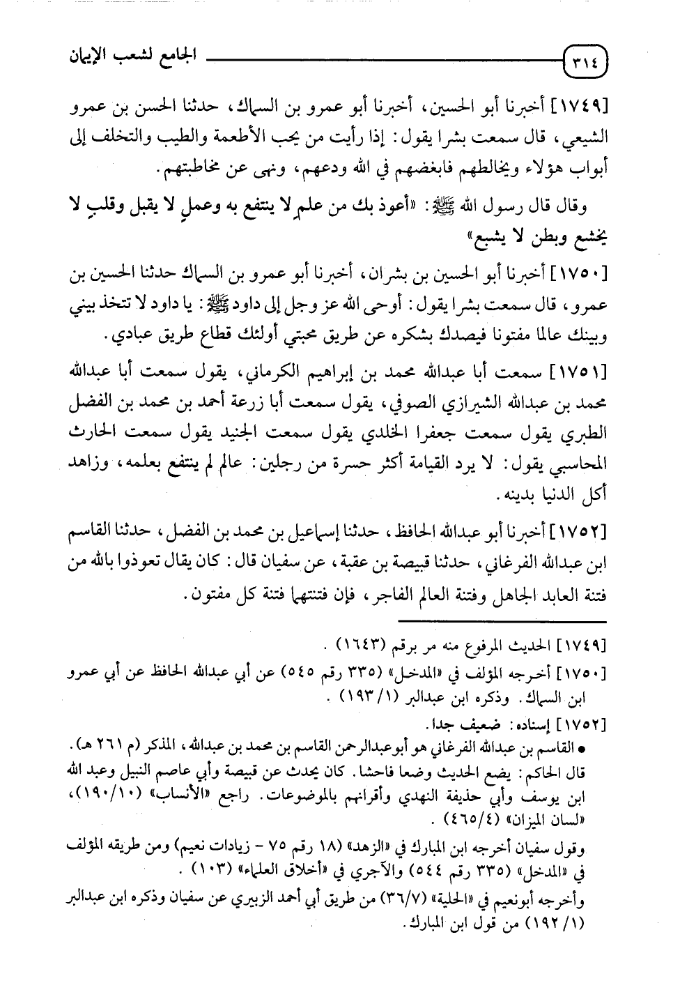 1751 - سَمِعْتُ أَبَا عَبْدِ اللهِ مُحَمَّدَ بْنَ إِبْرَاهِيمَ الْكِرْمَانِيَّ يَقُولُ: سَمِعْتُ أَبَا عَبْدِ اللهِ مُحَمَّدَ بْنَ عَبْدِ اللهِ الشِّيرَازِيَّ الصُّوفِيَّ يَقُولُ: سَمِعْتُ أَبَا زُرْعَةَ أَحْمَدَ بْنَ مُحَمَّدِ بْنِ الْفَضْلِ الطَّبَرِيَّ يَقُولُ: سَمِعْتُ جَعْفَرًا الْخَلَدِيَّ يَقُولُ: سَمِعْتُ الْجُنَيْدَ يَقُولُ: سَمِعْتُ الْحَارِثَ الْمُحَاسِبِيَّ يَقُولُ: " §لَا يَرِدُ الْقِيَامَةَ أَكْثَرَ حَسْرَةً من رَجُلَيْنِ: عَالِمٍ لَمْ يَنْتَفِعْ بِعِلْمِهِ، وَزَاهِدٍ أَكَلَ الدُّنْيَا بِدِينِهِ "