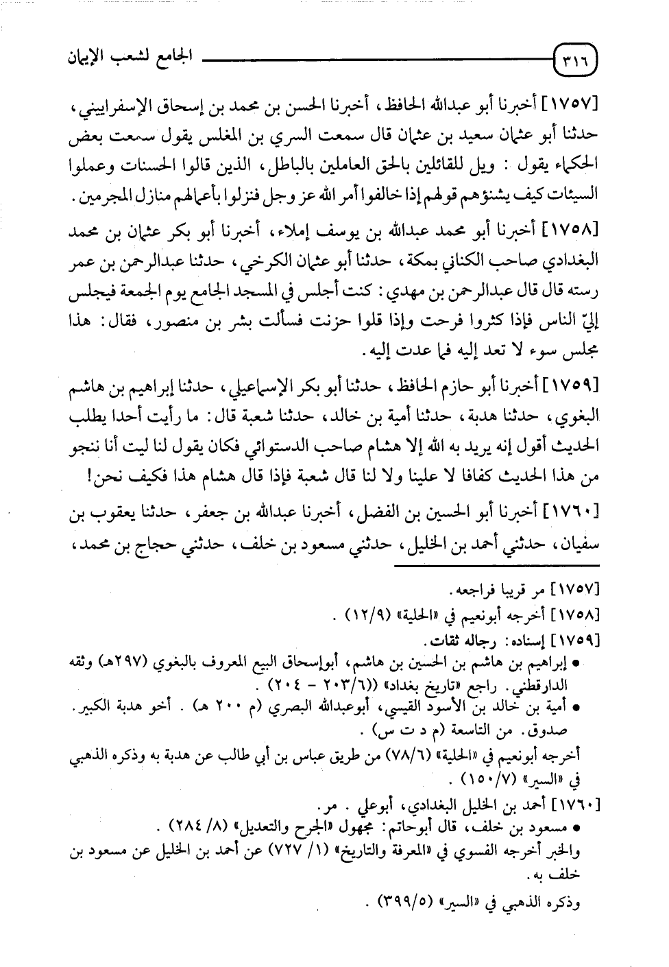 1757 - أَخْبَرَنَا أَبُو عَبْدِ اللهِ الْحَافِظُ، أخبرنا الْحَسَنُ بْنُ مُحَمَّدِ بْنِ إِسْحَاقَ الْإِسْفَرَايِينِيُّ، حدثنا أَبُو عُثْمَانَ سَعِيدُ بْنُ عُثْمَانَ قَالَ: سَمِعْتُ السَّرِيَّ الْمُغَلِّسَ يَقُولُ: سَمِعْتُ بَعْضَ الْحُكَمَاءِ يَقُولُ: §" وَيْلٌ لِلْقَائِلِينَ بِالْحَقِّ الْعَامِلِينَ بِالْبَاطِلِ الَّذِينَ قَالُوا الْحَسَنَاتِ وَعَمِلُوا السَّيِّئَاتِ، كَيْفَ يَشْنَؤُهُمْ قَوْلَهُمْ إِذَا خَالَفُوا أَمْرَ اللهِ عَزَّ وَجَلَّ، فَنَزَلُوا بِأَعْمَالِهِمْ مَنَازِلَ الْمُجْرِمِينَ "