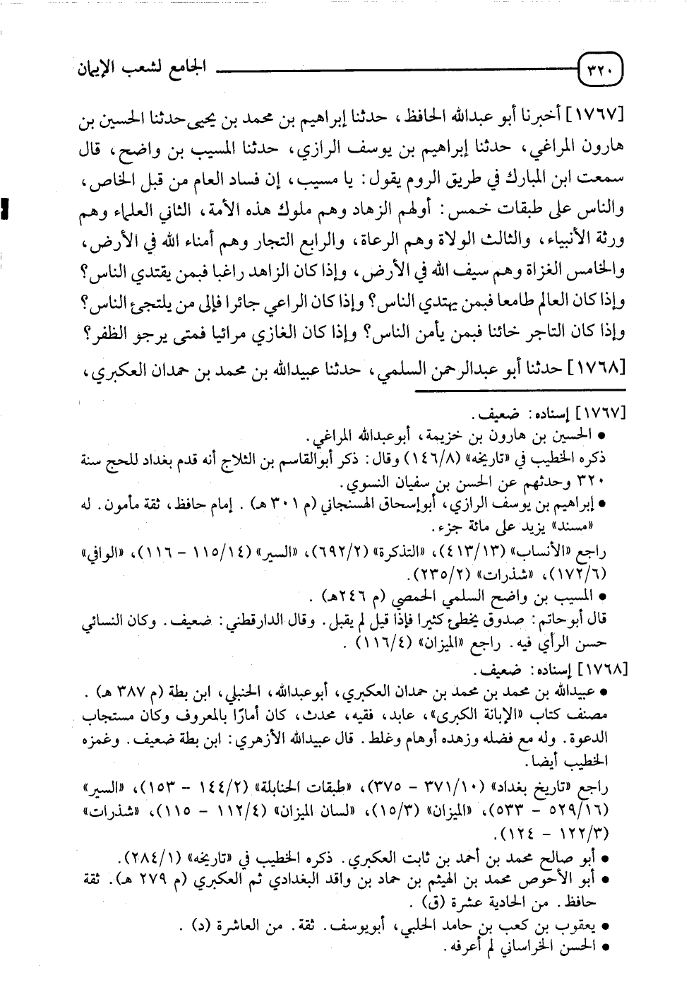 1767 - أَخْبَرَنَا أَبُو عَبْدِ اللهِ الْحَافِظُ، حدثنا إِبْرَاهِيمُ بْنُ مُحَمَّدِ بْنِ يَحْيَى، حدثنا الْحُسَيْنُ بْنُ هَارُونَ الْمَرَاغِيُّ، حدثنا إِبْرَاهِيمُ بْنُ يُوسُفَ الرَّازِيُّ، حدثنا الْمُسَيَّبُ بْنُ وَاضِحٍ قَالَ: سَمِعْتُ ابْنَ الْمُبَارَكِ، فِي طَرِيقِ الرُّومِ يَقُولُ: يَا مُسَيِّبُ، إِنَّ §فَسَادَ الْعَامِّ مِنْ قِبَلِ الْخَاصِّ، وَالنَّاسُ عَلَى خَمْسِ طَبَقَاتٍ: مِنْ أَوَّلِهِمْ الزُّهَّادُ وَهُمْ مُلُوكُ هَذِهِ الْأُمَّةِ، الثَّانِي: الْعُلَمَاءُ وَهُمْ وَرَثَةُ الْأَنْبِيَاءِ، وَالثَّالِثُ: الْوُلَاةُ وَهُمُ الرُّعَاةُ، وَالرَّابِعُ: التُّجَّارُ وَهُمْ أُمَنَاءُ اللهِ فِي الْأَرْضِ، وَالْخَامِسُ: الْغُزَاةُ وَهُمْ سَيْفُ اللهِ فِي الْأَرْضِ، وَإِذَا كَانَ الزَّاهِدُ رَاغِبًا فَبِمَنْ يَقْتَدِي النَّاسُ، وَإِذَا كَانَ الْعَالِمُ طَامِعًا فَبِمَنْ يَهْتَدِي النَّاسُ؟ وَإِذَا كَانَ الرَّاعِي جَائِرًا فَإِلَى مَنْ يَلْتَجِئُ النَّاسُ؟ وَإِذَا كَانَ التَّاجِرُ خَائِنًا فَبِمَنْ يَأْمَنُ النَّاسُ؟ وَإِذَا كَانَ الْغَازِي مُرَائِيًا فَمَتَى يَرْجُو الظَّفَرَ؟ "