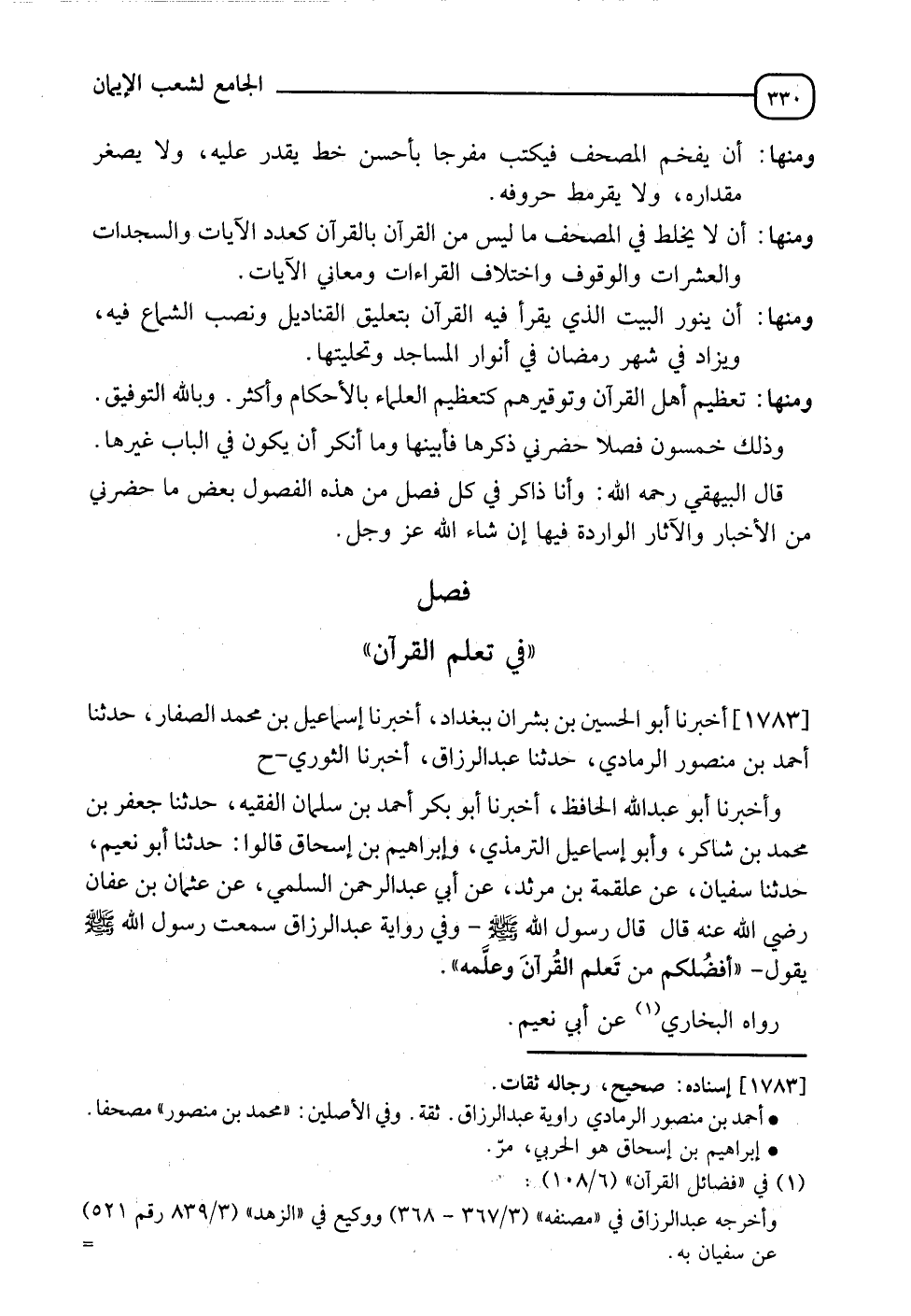1783 - أَخْبَرَنَا أَبُو الْحُسَيْنِ بْنُ بِشْرَانَ بِبَغْدَادَ، أخبرنا إِسْمَاعِيلُ بْنُ مُحَمَّدٍ الصَّفَارُ، حدثنا أَحْمَدُ بْنُ مَنْصُورٍ الرَّمَادِيُّ، حدثنا عَبْدُ الرَّزَّاقِ، أخبرنا الثَّوْرِيُّ، ح وَأَخْبَرَنَا أَبُو عَبْدِ اللهِ الْحَافِظُ، أخبرنا أَبُو بَكْرٍ أَحْمَدُ بْنُ سَلْمَانَ الْفَقِيهُ، حدثنا جَعْفَرُ بْنُ مُحَمَّدِ بْنِ شَاكِرٍ، وَأَبُو إِسْمَاعِيلَ التِّرْمِذِيُّ، وَإِبْرَاهِيمُ بْنُ إِسْحَاقَ قَالُوا: حدثنا أَبُو نُعَيْمٍ، حدثنا سُفْيَانُ، عَنْ عَلْقَمَةَ بْنِ مَرْثَدٍ، عَنِ أَبِي عَبْدِ الرَّحْمَنِ السُّلَمِيِّ، عَنْ عُثْمَانَ بْنِ عَفَّانَ رَضِيَ اللهُ عَنْهُ قَالَ: قَالَ رَسُولُ اللهِ صَلَّى اللَّهُ عَلَيْهِ وَسَلَّمَ - وَفِي رِوَايَةِ عَبْدِ الرَّزَّاقِ سَمِعْتُ رَسُولَ اللهِ صَلَّى اللَّهُ عَلَيْهِ وَسَلَّمَ - يَقُولُ: " §أَفْضَلُكُمْ مَنْ تَعَلَّمَ الْقُرْآنَ وَعَلَّمَهُ " رَوَاهُ الْبُخَارِيُّ، عَنْ أَبِي نُعَيْمٍ