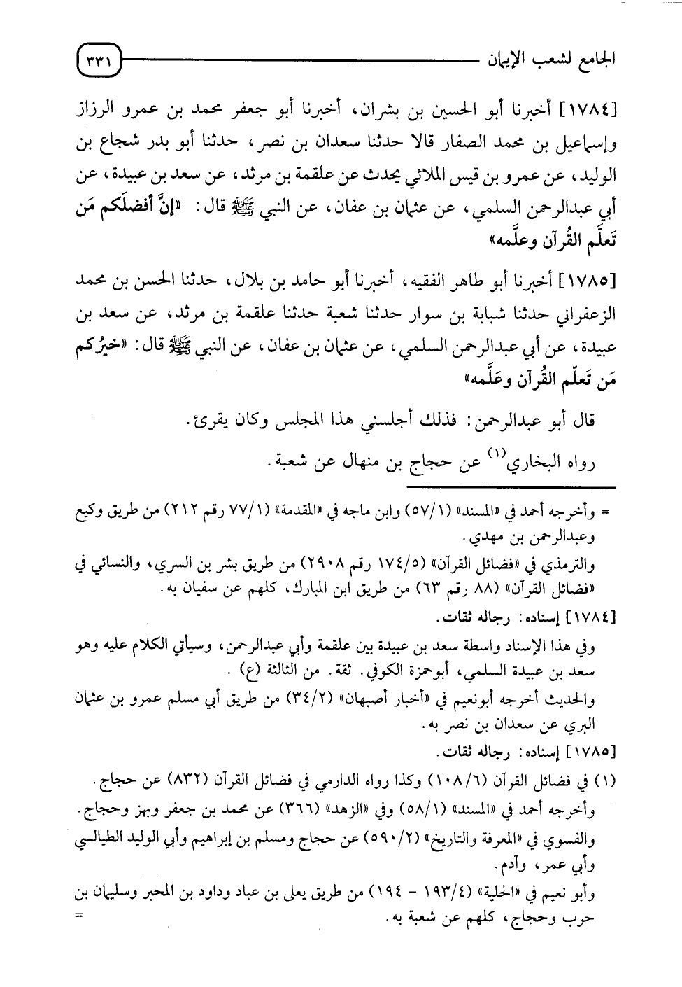 1785 - أَخْبَرَنَا أَبُو طَاهِرٍ الْفَقِيهُ، أخبرنا أَبُو حَامِدِ بْنُ بِلَالٍ، حدثنا الْحَسَنُ بْنُ مُحَمَّدٍ الزَّعْفَرَانِيُّ، حدثنا شَبَابَةُ بْنُ سَوَّارٍ، حدثنا شُعْبَةُ، حدثنا عَلْقَمَةُ بْنُ مَرْثَدٍ، عَنْ سَعْدِ بْنِ عُبَيْدَةَ، عَنْ أَبِي عَبْدِ الرَّحْمَنِ السُّلَمِيِّ، عَنْ عُثْمَانَ بْنِ عَفَّانَ، عَنِ النَّبِيِّ صَلَّى اللَّهُ عَلَيْهِ وَسَلَّمَ قَالَ: §" خَيْرُكُمْ مَنْ تَعَلَّمَ الْقُرْآنَ وَعَلَّمَهُ " قَالَ أَبُو عَبْدِ الرَّحْمَنِ: " فَذَلِكَ أَجْلَسَنِي هَذَا الْمَجْلِسَ، وَكَانَ يُقْرِئُ " رَوَاهُ الْبُخَارِيُّ، عَنْ حَجَّاجِ بْنِ مِنْهَالٍ، عَنْ شُعْبَةَ