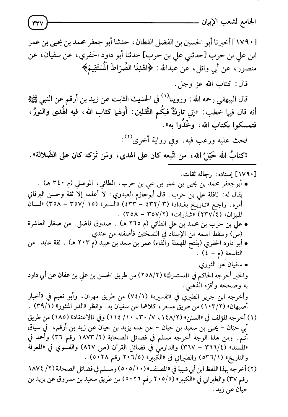 وَرُوِّينَا فِي الْحَدِيثِ الثَّابِتِ، عَنْ زَيْدِ بْنِ أَرْقَمَ، عَنِ النَّبِيِّ صَلَّى اللَّهُ عَلَيْهِ وَسَلَّمَ، أَنَّهُ قَالَ فِيمَا خَطَبَ: " §إِنِّي تَارِكٌ فِيكُمُ الثِّقْلَيْنِ، أَوَّلُهُمَا: كِتَابُ اللهِ فِيهِ الْهُدَى وَالنُّورُ، فَتَمَسَّكُوا بِكِتَابِ اللهِ وخُذُوا بِهِ " فَحَثَّ عَلَيْهِ وَرَغَّبَ فِيهِ وَفِي رِوَايَةٍ أُخْرَى: " كِتَابُ اللهِ حَبْلُ اللهِ مَنِ اتَّبَعَهُ كَانَ عَلَى الْهُدَى، وَمَنْ تَرَكَهُ كَانَ عَلَى الضَّلَالَةِ "