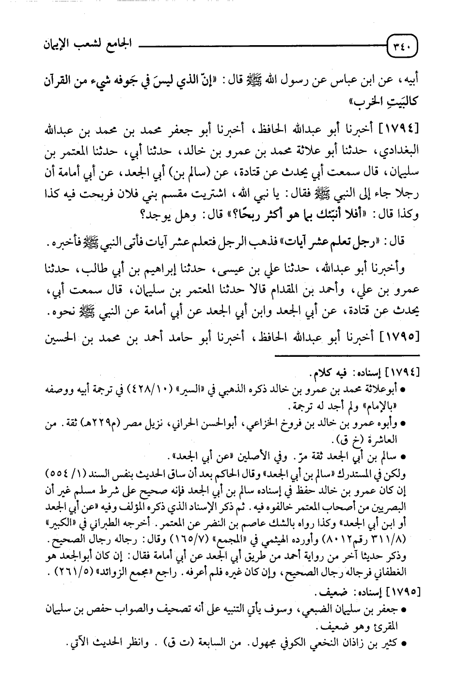 1794 - أَخْبَرَنَا أَبُو عَبْدِ اللهِ الْحَافِظُ، أخبرنا أَبُو جَعْفَرٍ مُحَمَّدُ بْنُ مُحَمَّدِ بْنِ عَبْدِ اللهِ الْبَغْدَادِيُّ، حدثنا أَبُو عُلَاثَةَ مُحَمَّدُ بْنُ عَمْرِو بْنِ خَالِدٍ، حدثنا أَبِي، حدثنا الْمُعْتَمِرُ بْنُ سُلَيْمَانَ قَالَ: سَمِعْتُ أَبِي يُحَدِّثُ عَنْ قَتَادَةَ، عَنْ سالم بن أَبِي الْجَعْدِ، عَنْ أَبِي أُمَامَةَ، أَنَّ رَجُلًا جَاءَ إلى النَّبِيِّ صَلَّى اللَّهُ عَلَيْهِ وَسَلَّمَ، فَقَالَ: يَا نَبِيَّ اللهِ، اشْتَرَيْتُ مِقْسَمَ بَنِي فُلَانٍ، فَرَبِحْتُ فِيهِ كَذَا وَكَذَا قَالَ: " §أَفَلَا أُنَبِّئُكُمْ بِمَا هُوَ أَكْثَرُ رِبْحًا؟ " قَالَ: وَهَلْ يُوجَدُ؟ قَالَ: " رَجُلٌ تَعَلَّمَ عَشْرَ آيَاتٍ " فَذَهَبَ الرَّجُلُ فَتَعْلَمَ عَشْرَ آيَاتٍ، فَأَتَى النَّبِيَّ صَلَّى اللَّهُ عَلَيْهِ وَسَلَّمَ فَأَخْبَرَهُ. وَأَخْبَرَنَا أَبُو عَبْدِ اللهِ، حدثنا عَلِيُّ بْنُ عِيسَى، حدثنا إِبْرَاهِيمُ بْنُ أَبِي طَالِبٍ، حدثنا عَمْرُو بْنُ عَلِيٍّ، وَأَحْمَدُ بْنُ الْمِقْدَامِ قَالَا: حدثنا الْمُعْتَمِرُ بْنُ سُلَيْمَانَ قَالَ: سَمِعْتُ أَبِي يُحَدِّثُ عَنْ قَتَادَةَ، عَنْ أَبِي الْجَعْدِ - أَوِ ابْنِ أَبِي الْجَعْدِ، عَنْ أَبِي أُمَامَةَ، عَنِ النَّبِيِّ صَلَّى اللَّهُ عَلَيْهِ وَسَلَّمَ نَحْوَهُ