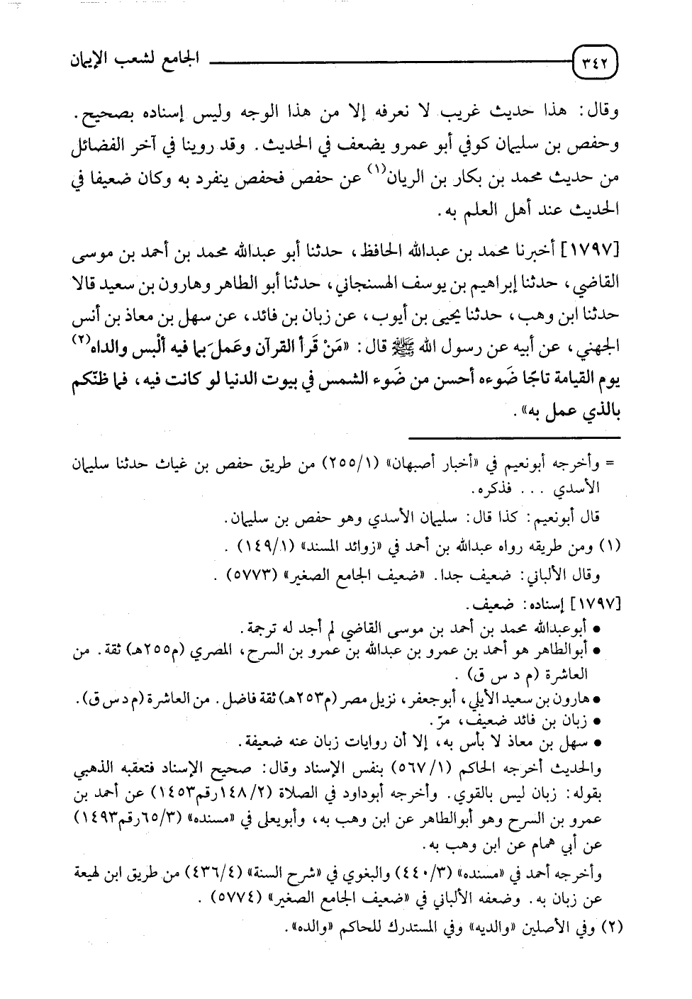 1797 - أَخْبَرَنَا مُحَمَّدُ بْنُ عَبْدِ اللهِ الْحَافِظُ، حدثنا أَبُو عَبْدِ اللهِ مُحَمَّدُ بْنُ أَحْمَدَ بْنِ مُوسَى الْقَاضِي، حدثنا إِبْرَاهِيمُ بْنُ يُوسُفَ الهسِّنْجَانِيُّ، حدثنا أَبُو الطَّاهِرِ، وَهَارُونُ بْنُ سَعِيدٍ قَالَا: حدثنا ابْنُ وَهْبٍ، عَنِ يحيى بْنِ أَيُّوبَ، عَنِ زَبَّانِ بْنِ فَائِدٍ، عَنِ سَهْلِ بْنِ مُعَاذِ بْنِ أَنَسٍ الْجُهَنِيِّ، عَنْ أَبِيهِ، عَنْ رَسُولَ اللهِ صَلَّى اللَّهُ عَلَيْهِ وَسَلَّمَ قَالَ: §" مَنْ قَرَأَ الْقُرْآنَ وَعَمِلَ بِمَا فِيهِ أُلْبِسَ وَالِدَاهُ يَوْمَ الْقِيَامَةِ تَاجًا، ضَوْءُهُ أَحْسَنُ مِنْ ضَوْءِ الشَّمْسِ فِي بُيُوتِ الدُّنْيَا لَوْ كَانَتْ فِيهِ، فَمَا ظَنُّكُمْ بِالَّذِي عَمِلَ بِهِ؟ "