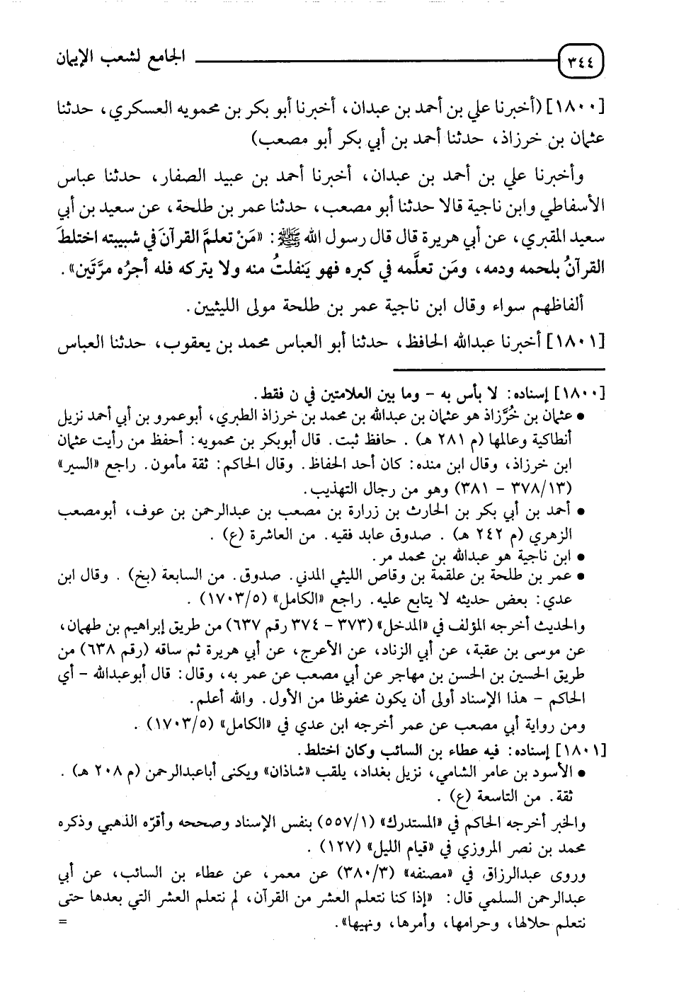 1800 - أَخْبَرَنَا عَلِيُّ بْنُ أَحْمَدَ بْنِ عَبْدَانَ، أَخْبَرَنَا أَبُو بَكْرِ بْنِ مُحَمَّوَيْهِ الْعَسْكَرِيُّ، حَدَّثَنَا عُثْمَانَ بْنُ خَرَّزَاذَ، حَدَّثَنَا أَحْمَدُ بْنُ أَبِي بَكْرٍ أَبُو مُصْعَبَ، وأَخْبَرَنَا عَلِيُّ بْنُ أَحْمَدَ بْنِ عَبْدَانَ، أَخْبَرَنَا أَحْمَدُ بْنُ عُبَيْدٍ الصَّفَارُ، حدثنا عَبَّاسٌ الْأَسْفَاطِيُّ، وَابْنُ نَاجِيَةَ قَالَا: حدثنا أَبُو مُصْعَبٍ، حدثنا عُمَرُ بْنُ طَلْحَةَ، عَنْ سَعِيدِ بْنِ أَبِي سَعِيدٍ الْمَقْبُرِيِّ، عَنْ أَبِي هُرَيْرَةَ قَالَ: قَالَ رَسُولُ اللهِ صَلَّى اللَّهُ عَلَيْهِ وَسَلَّمَ: " §مَنْ تَعَلَّمَ الْقُرْآنَ فِي شَبِيبَتِهِ اخْتَلَطَ الْقُرْآنُ بِلَحْمِهِ وَدَمِهِ، وَمَنْ تَعَلَّمَهُ فِي كِبَرِهِ فَهُوَ يَنْفَلِتُ مِنْهُ وَلَا يَتْرُكُهُ، فَلَهُ أَجْرُهُ مَرَّتَيْنِ " أَلْفَاظُهُمْ سَوَاءٌ. وَقَالَ ابْنُ نَاجِيَةَ: " عُمَرُ بْنُ طَلْحَةَ مَوْلَى اللَّيْثِيِّينَ "