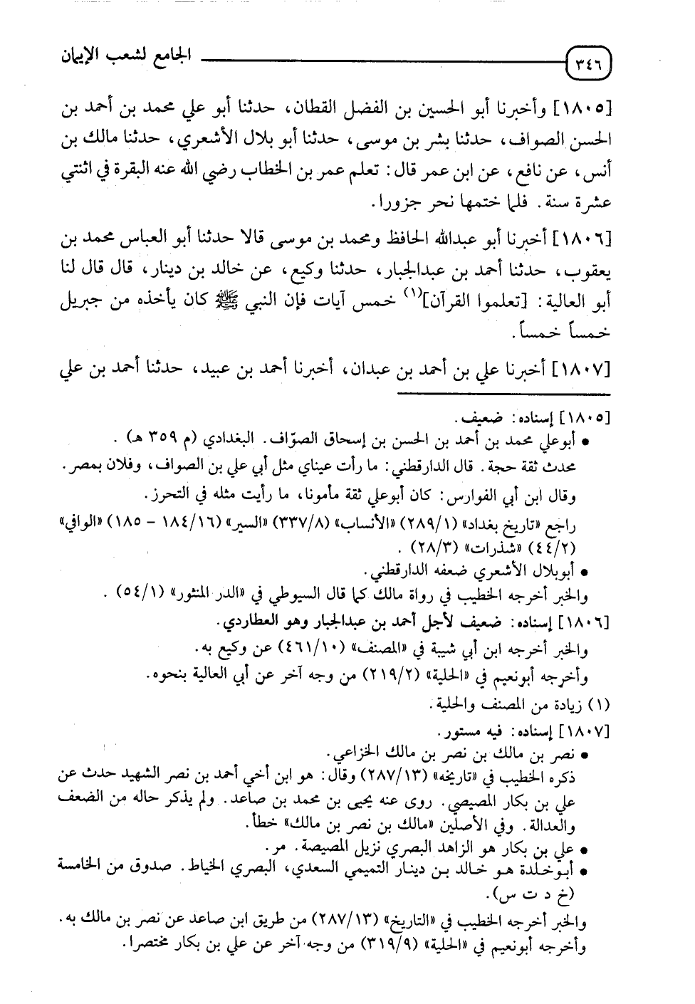 1805 - وَأَخْبَرَنَا أَبُو الْحُسَيْنِ بْنُ الْفَضْلِ الْقَطَّانُ، حدثنا أَبُو عَلِيٍّ مُحَمَّدُ بْنُ أَحْمَدَ بْنِ الْحَسَنِ الصَّوَّافُ، حدثنا بِشْرُ بْنُ مُوسَى أَبُو بِلَالٍ الْأَشْعَرِيُّ، حدثنا مَالِكُ بْنُ أَنَسٍ، عَنْ نَافِعٍ، عَنِ ابْنِ عُمَرَ قَالَ: §" تَعَلَّمَ عُمَرُ بْنُ الْخَطَّابِ رَضِيَ اللهُ عَنْهُ الْبَقَرَةَ فِي اثْنَتَيْ عَشْرَةَ سَنَةً، فَلَمَّا خَتَمَهَا نَحَرَ جَزُورًا "