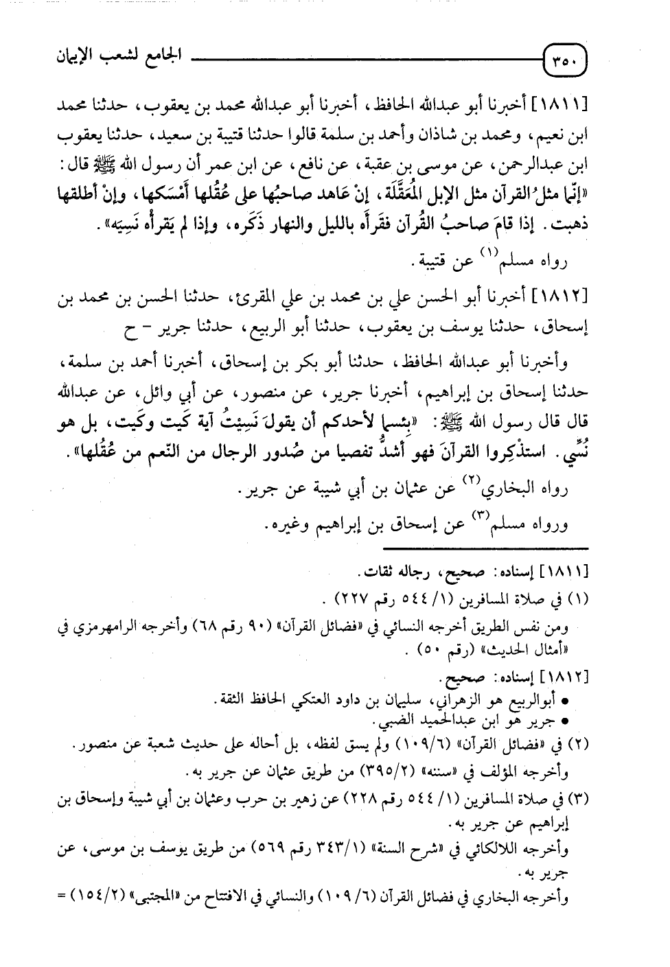 1812 - أخبرنا أَبُو الْحَسَنِ عَلِيُّ بْنُ مُحَمَّدِ بْنِ عَلِيٍّ الْمُقْرِئُ، حدثنا الْحَسَنُ بْنُ مُحَمَّدِ بْنِ إِسْحَاقَ، حدثنا يُوسُفُ بْنُ يَعْقُوبَ، حدثنا أَبُو الرَّبِيعِ، حدثنا جَرِيرُ، ح وَأَخْبَرَنَا أَبُو عَبْدِ اللهِ الْحَافِظُ، حدثنا أَبُو بَكْرِ بْنُ إِسْحَاقَ، أخبرنا أَحْمَدُ بْنُ سَلَمَةَ، حدثنا إِسْحَاقُ بْنُ إِبْرَاهِيمَ، أخبرنا جَرِيرٌ، عَنْ مَنْصُورٍ، عَنْ أَبِي وَائِلٍ، عَنْ عَبْدِ اللهِ قَالَ: قَالَ رَسُولُ اللهِ صَلَّى اللَّهُ عَلَيْهِ وَسَلَّمَ: " بِئْسَ مَا لِأَحَدِكُمْ أَنْ يَقُولَ: نَسِيتُ آيَةَ كَيْتَ وَكَيْتَ بَلْ هُوَ نُسِّيَ، §اسْتَذْكِرُوا الْقُرْآنَ فَهُوَ أَشَدُّ تَفَصِّيًا مِنْ صُدُورِ الرِّجَالِ مِنَ النَّعَمِ مِنْ عُقُلِهَا " رَوَاهُ الْبُخَارِيُّ، عَنْ عُثْمَانَ بْنِ أَبِي شَيْبَةَ، عَنْ جَرِيرٍ وَرَوَاهُ مُسْلِمٌ، عَنْ إِسْحَاقَ بْنِ إِبْرَاهِيمَ وَغَيْرِهِ