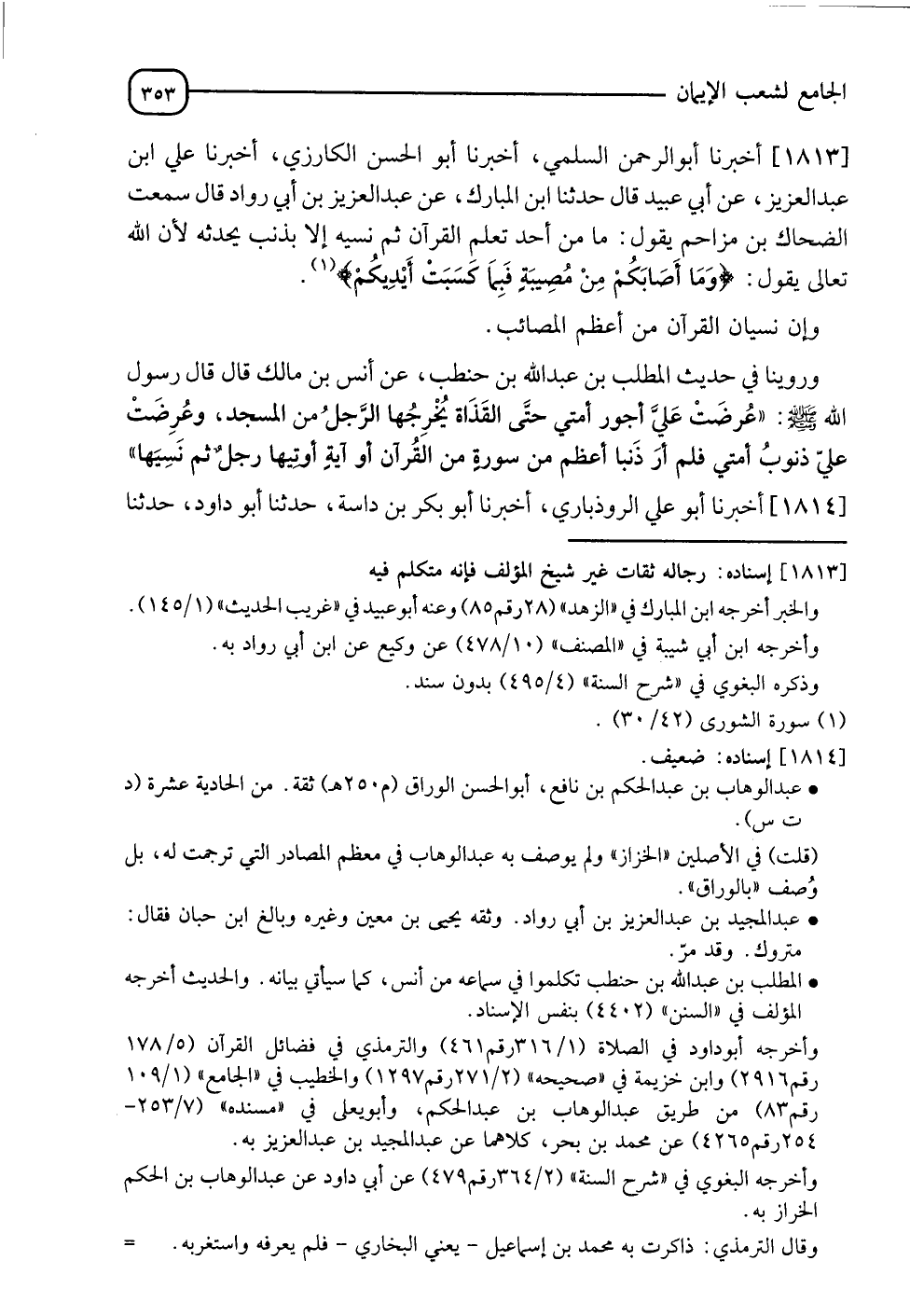 1813 - أَخْبَرَنَا أَبُو عَبْدِ الرَّحْمَنِ السُّلَمِيُّ، أخبرنا أَبُو الْحَسَنِ الْكَارِزِيُّ، أخبرنا عَلِيُّ بْنُ عَبْدِ الْعَزِيزِ، عَنْ أَبِي عُبَيْدٍ قَالَ: حدثنا ابْنُ الْمُبَارَكِ، عَنْ عَبْدِ الْعَزِيزِ بْنِ أَبِي رَوَّادٍ قَالَ: سَمِعْتُ الضَّحَّاكَ بْنَ مُزَاحِمٍ يَقُولُ: §" مَا مِنْ أَحَدٍ تَعَلَّمَ الْقُرْآنَ ثُمَّ نَسِيَهُ إِلَّا بِذَنْبٍ يُحْدِثُهُ لِأَنَّ اللهَ تَعَالَى يَقُولُ: {وَمَا أَصَابَكُمْ مِنْ مُصِيبَةٍ فَبِمَا كَسَبَتْ أَيْدِيكُمْ} [الشورى: 30] وَإِنَّ نِسْيَانَ الْقُرْآنِ مِنْ أَعْظَمِ الْمَصَائِبِ "