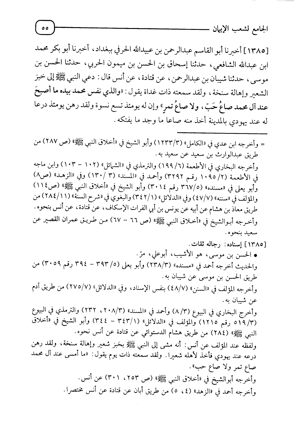 1385 - أَخْبَرَنَا أَبُو الْقَاسِمِ عَبْدُ الرَّحْمَنِ بْنُ عُبَيْدِ اللهِ الْحُرْفِيُّ بِبَغْدَادَ، أخبرنا أَبُو بَكْرٍ مُحَمَّدُ بْنُ عَبْدِ اللهِ الشَّافِعِيُّ، حدثنا إِسْحَاقُ بْنُ الْحَسَنِ بْنِ مَيْمُونٍ الْحَرْبِيُّ، حدثنا الْحَسَنُ بْنُ مُوسَى، حدثنا شَيْبَانُ بْنُ عَبْدِ الرَّحْمَنِ، عَنْ قَتَادَةَ، عَنْ أَنَسٍ قَالَ: دُعِيَ النَّبِيُّ صَلَّى اللَّهُ عَلَيْهِ وَسَلَّمَ، إِلَى خُبْزِ الشَّعِيرِ وَإِهَالَةِ سَنِخَةٍ، وَلَقَدْ سَمِعْتُهُ ذَاتَ غَدَاةٍ يَقُولُ: " وَالَّذِي نَفْسُ مُحَمَّدٍ بِيَدِهِ §مَا أَصْبَحَ عِنْدَ آلِ مُحَمَّدٍ صَاعُ حَبٍّ وَلَا صَاعُ تَمُرٍّ، وَإِنَّ لَهُ يَوْمَئِذٍ تِسْعَ نِسْوَةٍ، وَلَقَدْ رَهَنَ يَوْمَئِذٍ دِرْعًا لَهُ عِنْدَ يَهُودِيٍّ بِالْمَدِينَةِ أَخَذَ مِنْهُ صَاعًا مَا وَجَدَ مَا يَفْتَكُّهُ "