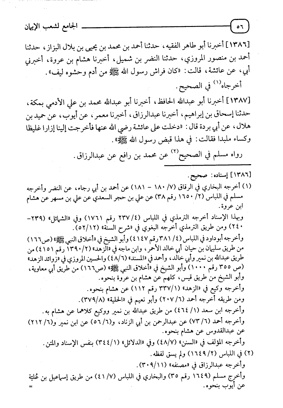 1386 - أَخْبَرَنَا أَبُو طَاهِرٍ الْفَقِيهُ، حدثنا أَحْمَدُ بْنُ مُحَمَّدِ بْنِ يَحْيَى بْنِ بِلَالٍ الْبَزَّاز، حدثنا أَحْمَدُ بْنُ مَنْصُورٍ الْمَرْوَزِيُّ، حدثنا النَّضْرُ بْنُ شُمَيْلٍ، أخبرنا هِشَامُ بْنُ عُرْوَةَ، أَخْبَرَنِي أَبِي، عَنْ عَائِشَةَ، قَالَتْ: §" كَانَ فِرَاشُ رَسُولِ اللهِ صَلَّى اللَّهُ عَلَيْهِ وَسَلَّمَ مِنْ أَدَمَ، وَحَشْوُهُ مِنْ لِيفٍ " أَخْرَجَاهُ فِي الصَّحِيحِ
