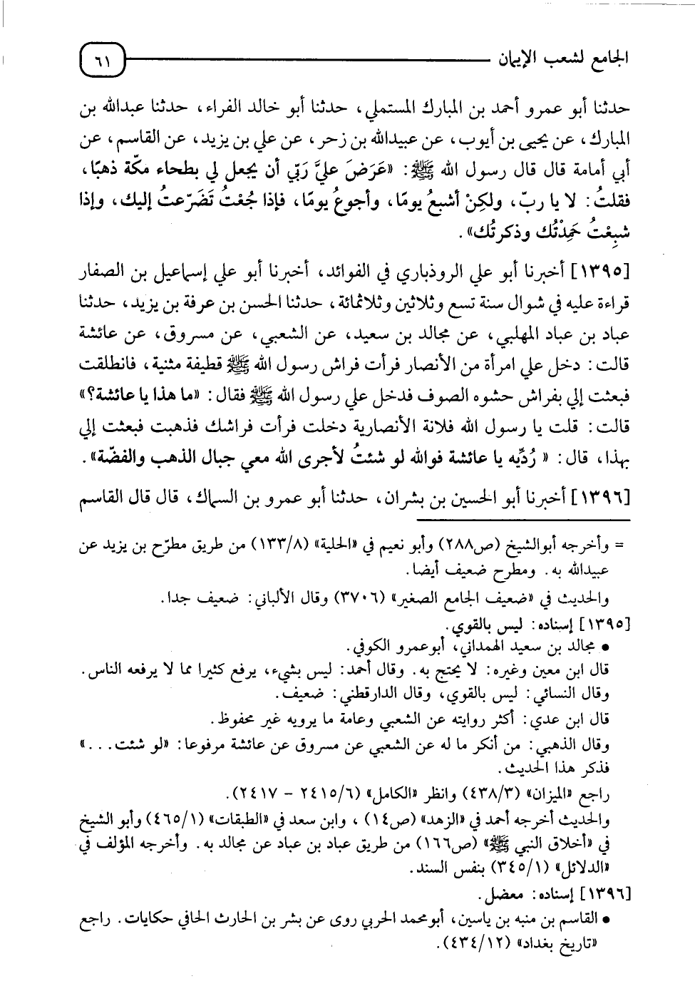 1395 - أَخْبَرَنَا أَبُو عَلِيٍّ الرُّوذْبَارِيُّ فِي الْفَوَائِدِ، أخبرنا أَبُو عَلِيٍّ إِسْمَاعِيلُ بْنُ الصَّفَّارِ قِرَاءَةً عَلَيْهِ فِي شَوَّالٍ. سَنَةَ تِسْعٍ وَثَلَاثِينَ وَثَلَاثِمَائةٍ، حدثنا الْحَسَنُ بْنُ عَرَفَةَ بْنِ يَزِيدَ، حدثنا عَبَّادُ بْنُ عَبَّادٍ الْمُهَلَّبِيُّ، عَنْ مُجَالِدِ بْنِ سَعِيدٍ، عَنِ الشَّعْبِيِّ، عَنْ مَسْرُوقٍ، عَنْ عَائِشَةَ قَالَتْ: دَخَلَتْ عَلَيَّ امْرَأَةٌ مِنَ الْأَنْصَارِ فَرَأَتْ فِرَاشَ رَسُولِ اللهِ صَلَّى اللَّهُ عَلَيْهِ وَسَلَّمَ قَطِيفَةٌ مَثْنِيَّةٌ، فَانْطَلَقَتْ فَبَعَثَتْ إِلَيَّ بِفِرَاشٍ حَشْوُهُ الصُّوفُ، فَدَخَلَ عَلَيَّ رَسُولُ اللهِ صَلَّى اللَّهُ عَلَيْهِ وَسَلَّمَ فَقَالَ: " مَا هَذَا يَا عَائِشَةُ؟ " قَالَتْ: قُلْتُ: يَا رَسُولَ اللهِ فُلَانَةٌ الْأَنْصَارِيَّةُ دَخَلَتْ عَلَيَّ، فَرَأَتْ فِرَاشَكَ فَذَهَبَتْ فَبَعَثَتْ إِلَيَّ بِهَذَا قَالَ: " §رُدِّيهِ يَا عَائِشَةُ، فَوَاللهِ لَوْ شِئْتُ لَأَجْرَى اللهُ مَعِيَ جِبَالَ الذَّهَبِ وَالْفِضَّةِ "