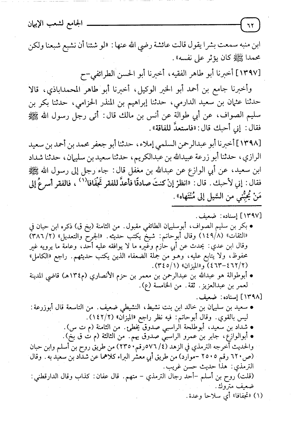 1398 - أَخْبَرَنَا أَبُو عَبْدِ الرَّحْمَنِ السَّلَمِيُّ إِمْلَاءً، حدثنا أَبُو جَعْفَرٍ مُحَمَّدُ بْنُ أَحْمَدَ بْنِ سَعِيدٍ الرَّازِيُّ، حدثنا أَبُو زُرْعَةَ عُبَيْدِ اللهِ بْنِ عَبْدِ الْكَرِيمِ حدثنا سَعِيدُ بْنُ سُلَيْمَانَ، حدثنا شَدَّادُ بْنُ سَعِيدٍ، عَنْ أَبِي الْوَازِعِ، عَنْ عَبْدِ اللهِ بْنِ مُغَفَّلٍ قَالَ: جَاءَ رَجُلٌ إِلَى رَسُولِ اللهِ صَلَّى اللَّهُ عَلَيْهِ وَسَلَّمَ فَقَالَ: إِنِّي لَأُحِبُّكَ قَالَ: §" انْظُرْ إِنْ كُنْتَ صَادِقًا فَأَعِدَّ لِلْفَقْرِ تِجْفَافًا، فَالْفَقْرُ أَسْرَعُ إِلَى مَنْ يُحِبُّنِي مِنَ السَّيْلِ إِلَى مُنْتَهَاهُ " -[63]- قَالَ الْبَيْهَقِيُّ رَحِمَهُ اللهُ: وَكَذَلِكَ رَوَاهُ جَمَاعَةٌ، عَنْ شَدَّادٍ أَبِي طَلْحَةَ الرَّاسِبِيِّ تَفَرَّدَ بِهِ