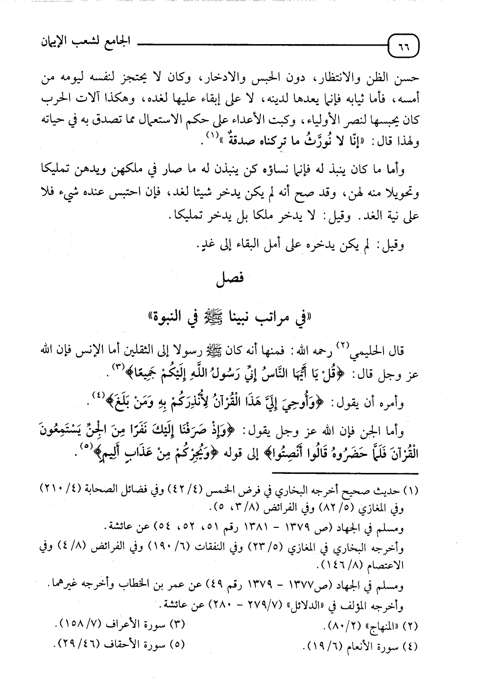 §فَصْلٌ فِي بَرَاءَةِ نَبِيِّنَا صَلَّى اللَّهُ عَلَيْهِ وَسَلَّمَ فِي النُّبُوَّةِ قَالَ الْحَلِيمِيُّ رَحِمَهُ اللهُ: " فَمِنْهَا أَنَّهُ كَانَ صَلَّى اللَّهُ عَلَيْهِ وَسَلَّمَ رَسُولُا إِلَى الثَّقَلَيْنِ، أَمَّا الْإِنْسُ، فَإِنَّ اللهَ عَزَّ وَجَلَّ قَالَ: {قُلْ يَا أَيُّهَا النَّاسُ إِنِّي رَسُولُ اللهِ إِلَيْكُمْ جَمِيعًا} [الأعراف: 158] وَأَمَرَهُ أَنْ يَقُولَ: {وَأُوحِيَ إِلَيَّ هَذَا الْقُرْآنُ لِأُنْذِرَكُمْ بِهِ وَمَنْ بَلَغَ} [الأنعام: 19] وَأَمَّا الْجِنُّ فَإِنَّ اللهَ عَزَّ وَجَلَّ يَقُولُ: {وَإِذْ صَرَفْنَا إِلَيْكَ نَفَرًا مِنَ الْجِنِّ يَسْتَمِعُونَ الْقُرْآنَ فَلَمَّا حَضَرُوهُ قَالُوا أَنْصِتُوا} [الأحقاف: 29] إِلَى قَوْلِهِ: {وُيُجْرِكُمْ مِنْ عَذَابٍ أَلِيمٍ} [الأحقاف: 31]،