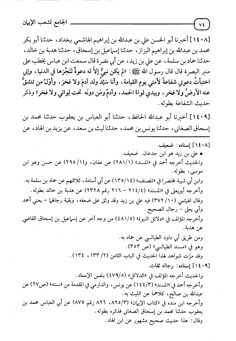 1408 - أَخْبَرَنَا أَبُو الْحَسَنِ عَلِيُّ بْنُ عَبْدِ اللهِ بْنِ إِبْرَاهِيمَ الْهَاشِمِيُّ بِبَغْدَادَ، حدثنا أَبُو بَكْرٍ مُحَمَّدُ بْنُ عَبْدِ اللهِ بْنِ إِبْرَاهِيمَ الْبَزَّازُ، حدثنا إِسْمَاعِيلُ بْنُ إِسْحَاقَ، حدثنا هُدْبَةُ بْنُ خَالِدٍ، حدثنا حَمَّادُ بْنُ سَلَمَةَ، عَنْ عَلِيِّ بْنِ زَيْدٍ، عَنْ أَبِي نَضْرَةَ قَالَ: سَمِعْتُ ابْنَ عَبَّاسٍ يَخْطُبُ عَلَى مِنْبَرِ الْبَصْرَةِ قَالَ: قَالَ رَسُولُ اللهِ صَلَّى اللَّهُ عَلَيْهِ وَسَلَّمَ: " §لَمْ يَكُنْ نَبِيٌّ إِلَّا لَهُ دَعْوَةٌ تَنَجَّزَهَا فِي الدُّنْيَا، وَإِنِّي اخْتَبَأْتُ دَعْوَتِي شَفَاعَةً لِأُمَّتِي يَوْمَ الْقِيَامَةِ، وَأَنَا سَيِّدُ وَلَدِ آدَمَ وَلَا فَخْرَ، وَأَوَّلُ مَنْ تَنْشَقُّ عَنْهُ الْأَرْضُ وَلَا فَخْرَ، وَبِيَدِي لِوَاءُ الْحَمْدِ، وَآدَمُ وَمَنْ دُونَهُ تَحْتَ لِوَائِي وَلَا فَخْرَ " وَذَكَرَ حَدِيثَ الشَّفَاعَةِ بِطُولِهِ