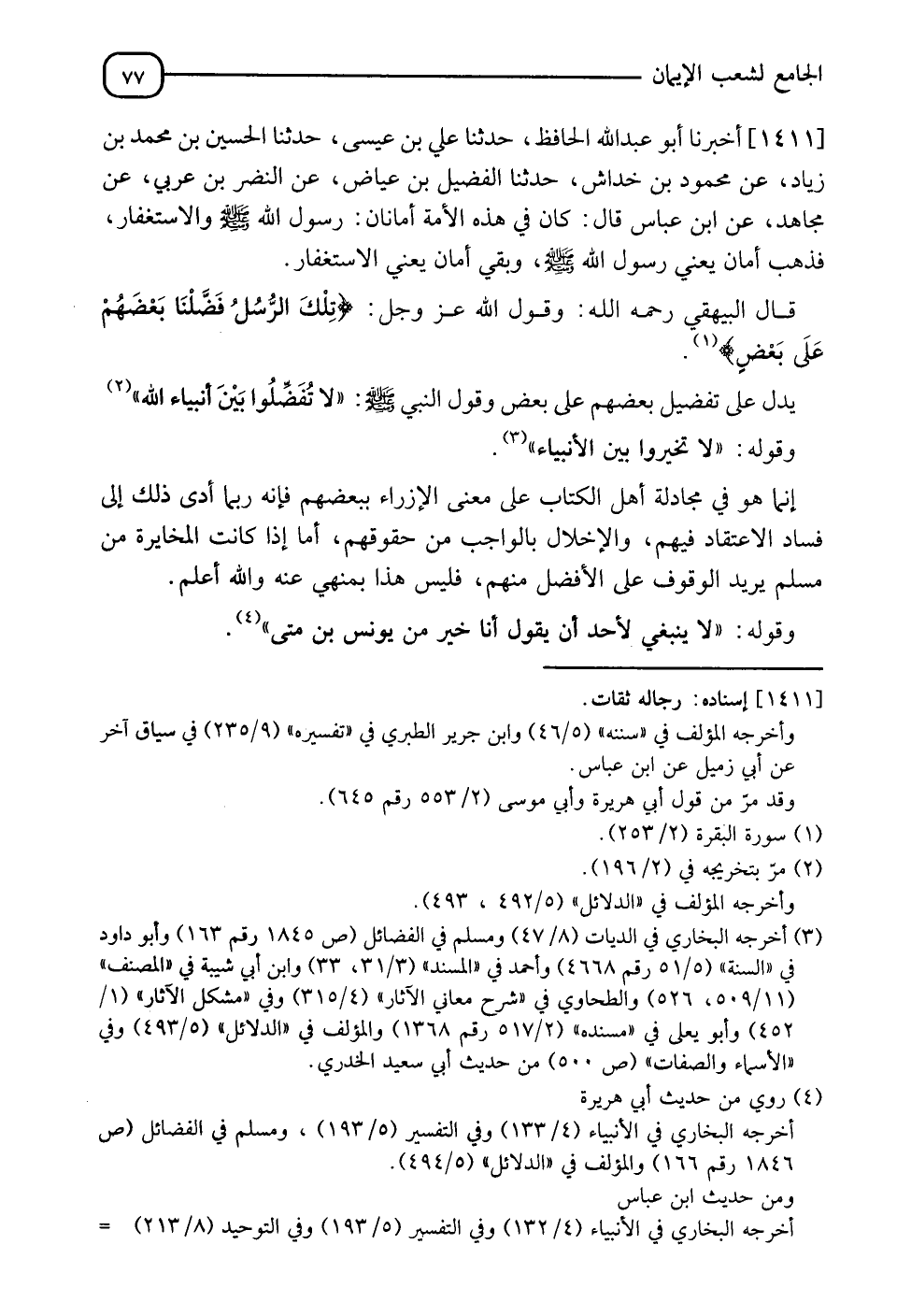 1411 - أَخْبَرَنَا أَبُو عَبْدِ اللهِ الْحَافِظُ، حدثنا عَلِيُّ بْنُ عِيسَى، حدثنا الْحُسَيْنُ بْنُ مُحَمَّدِ بْنِ زِيَادٍ، عَنْ مَحْمُودِ بْنِ خِدَاشٍ، حدثنا الْفُضَيْلُ بْنُ عِيَاضٍ، عَنِ النَّضْرِ بْنِ عَرَبِيٍّ، عَنْ مُجَاهِدٍ، عَنِ ابْنِ عَبَّاسٍ قَالَ: §" كَانَ فِي هَذِهِ الْأُمَّةِ أَمَانَانِ رَسُولُ اللهِ صَلَّى اللَّهُ عَلَيْهِ وَسَلَّمَ وَالِاسْتِغْفَارُ فَذَهَبَ أَمَانٌ - يَعْنِي - رَسُولَ اللهِ صَلَّى اللَّهُ عَلَيْهِ وَسَلَّمَ، وَبَقِيَ أَمَانٌ - يَعْنِي - الِاسْتِغْفَارَ " قَالَ الْبَيْهَقِيُّ رَحِمَهُ اللهُ: " وَقَوْلُ اللهِ عَزَّ وَجَلَّ: {تِلْكَ الرُّسُلُ فَضَّلْنَا بَعْضَهُمْ عَلَى بَعْضٍ} [البقرة: 253] يَدُلُّ عَلَى تَفْضِيلِ بَعْضِهِمْ عَلَى بَعْضٍ، وَقَوْلُ النَّبِيِّ صَلَّى اللَّهُ عَلَيْهِ وَسَلَّمَ: " لَا تُفَضِّلُوا بَيْنَ أَنْبِيَاءِ اللهِ "، وَقَوْلُهُ: " لَا تُخَيِّرُوا بَيْنَ الأنْبِيَاءِ " إِنَّمَا هُوَ فِي مُجادلَةِ أَهْلِ الْكِتَابِ عَلَى مَعْنَى الْإِزْرَاءِ بِبَعْضِهِمْ، فَإِنَّهُ رُبَّمَا أَدَّى ذَلِكَ إِلَى فَسَادِ الِاعْتِقَادِ فِيهِمْ وَالْإخلَالِ بالْوَاجِبِ مِنْ حُقُوقِهِمْ، أَمَّا إِذَا كَانَتِ الْمُخَايَرَةُ مِنْ مُسْلِمٍ يُرِيدُ الْوُقُوفَ عَلَى الْأَفْضَلِ مِنْهُمْ فَلَيْسَ هَذَا بِمَنْهِيٍ عَنْهُ وَاللهُ أَعْلَمُ، وَقَوْلُهُ: " لَا يَنْبَغِي لِأَحَدٍ أَنْ يَقُولَ: أَنَا خَيْرٌ مِنْ يُونُسَ بْنِ مَتَّى "، -[78]- فَإِنَّه أَرَادَ وَاللهُ أَعْلَمُ مَنْ سِوَاهُ مِنَ النَّاسِ دُونَ نَفْسِهِ أَوْ ذَهَبَ فِي ذَلِكَ مَذْهَبَ التَّوَاضُعِ لِرَبِّهِ وَالْهَضْمِ لِنَفْسِهِ، وَكَذَلِكَ فِي قَوْلِهِ: حِينَ قِيلَ: يَا خَيْرَ الْبَرِّيَّةِ " ذَلكَ إِبْرَاهِيمُ عَلَيْهِ السَّلَامُ "، وَكَانَ لَا يُحِبُّ الْمُبَالَغَةَ فِي الثَّنَاءِ عَلَيْهِ فِي وَجْهِهِ تَوَاضُعًا لِرَبِّهِ عَزَّ وَجَلَّ وَكَانَ يَقُولُ: " لَا تُطْرُونِي كَمَا أَطْرَتِ النَّصَارَى عِيسَى ابْنَ مَرْيَمَ، فَإِنَّمَا أَنَا عَبْدٌ فَقُولُوا: عَبْدُ اللهِ وَرَسُولُهُ " وَقَدْ تَكَلَّمْنَا عَلَى هَذَا فِي الْجُزْءِ التَّاسِعِ وَالثَّلَاثِينَ مِنْ كِتَابِ دَلَائِلِ النُّبُوَّةِ بِأَكْثَرَ مِنْ هَذَا، وَأَمَّا اتِّخَاذُ اللهِ تعالى إِبْرَاهِيمَ خَلِيلًا، فَإِنَّهُ إِنَّمَا اتَّخَذَهُ خَلِيلًا عَلَى مَنْ كَانَ فِي عَصْرِهِ مِنْ أَعْدَاءِ اللهِ عَزَّ وَجَلَّ لَا عَلَى غَيْرِهِ مِنَ النَّبِيِّينَ، وَهُوَ أَنَّهُ هَدَاهُ إِلَى مَعْرِفَتِهِ وَوَفَّقَهُ -[79]- لِتَوْحِيدِهِ حِينَ كَانَ الْكُفْرُ طَبَّقَ الْأَرْضَ، وَلَمْ يَكُنْ فِي الدُّنْيَا نَسَمَةٌ تَعْرِفُ اللهَ وَتَعْتَرِفُ بِهِ غَيْرُهُ وَاتَّخَذَهُ خَلِيلًا بِأَنْ جَعَلَهُ أَهْلًا لِهِدَايَتِهِ أَوَلَا، ثُمَّ بِأَنْ أَمْرَهُ وَنَهَاهُ فَظَهَرَتْ مِنْهُ الطَّاعَةُ ثَانِيًا، ثُمَّ بِأَنِ ابْتَلَاهُ فَوَجَدَ مِنُهُ الصَّبْرَ ثَالِثًا، فَكَانَ يَوْمَئِذٍ خَلِيلَهُ وَأَهْلُ الْأَرْضِ كُلُّهُمْ أَعْدَاؤُهُ لِأَنَّهُ كَانَ الْمُطِيعَ وَالنَّاسُ غَيْرُهُ عُصَاةٌ، وَقَدِ اتُّخِذَ اللهُ مُحَمَّدًا صَلَّى اللَّهُ عَلَيْهِ وَسَلَّمَ حَبِيبًا بِدَلَالَةِ الْكِتَابِ وَهُوَ قَوْلُهُ عَزَّ وَجَلَّ: {قُلْ إِنْ كُنْتُمْ تُحِبُّونَ اللهَ فَاتَّبَعُونِي يُحْبِبْكُمُ اللهُ} [آل عمران: 31] فَإِذَا كَانَ اتِّبَاعُهُ يُفِيدُ لِلْمُتَّبِعِ مَحَبَّةَ اللهِ عَزَّ وَجَلُّ فَالْمُتَّبَعُ بِهَا يَكُونُ أَوْلَى، وَدَرَجَةُ الْمَحَبَّةِ فَوْقَ دَرَجَةِ الْخُلَّةِ، وَقَدْ تَكَلَّمَ أَهْلُ الْعِلْمِ فِي الْفَرَقِ بَيْنَ الْحَبِيبِ وَالْخَلِيلِ بِكَلَامٍ كَثِيرٍ وَهُوَ فِي كُتُبِ أَهْلِ التَّذْكِيرِ مَذْكُورٌ "