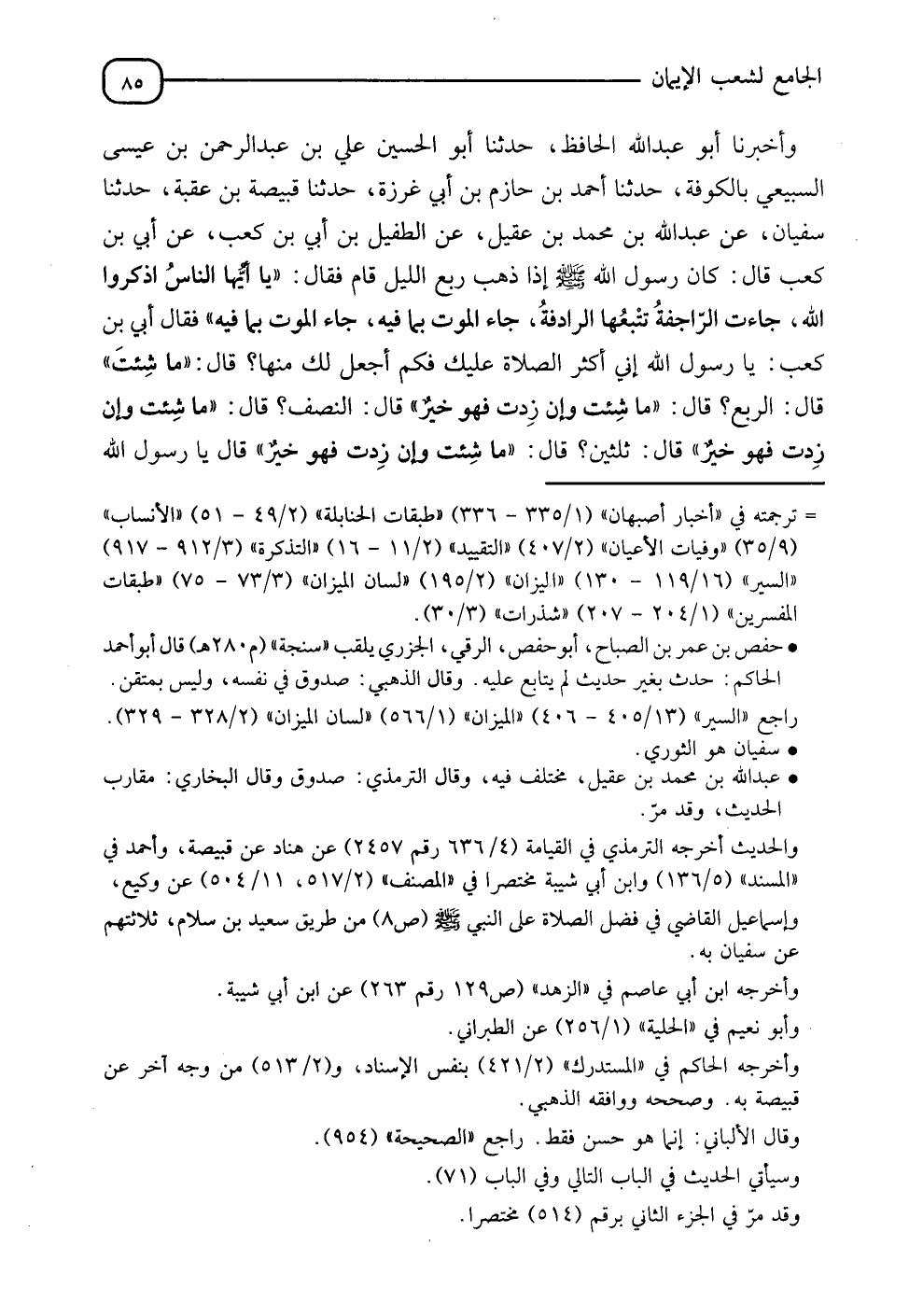 فَقَالَ لَهُ أُبَيُّ بْنُ كَعْبٍ: يَا رَسُولَ اللهِ، §إِنِّي أُكْثِرُ الصَّلَاةَ عَلَيْكَ فَكَمْ أَجْعَلُ لَكَ مِنْهَا؟ قَالَ: " مَا شِئْتَ "، قَالَ: الرُّبْعُ؟ قَالَ: " مَا شِئْتَ، وَإِنْ زِدْتَ فَهُوَ خَيْرٌ "، قَالَ: النِّصْفُ؟ قَالَ " مَا شِئْتَ، وَإِنْ زِدْتَ فَهُوَ خَيْرٌ "، قَالَ: ثُلُثَيْنِ؟ قَالَ: " مَا شِئْتَ، وَإِنْ زِدْتَ فَهُوَ خَيْرٌ "، قَالَ: يَا رَسُولَ اللهِ -[86]- أَجْعَلُهَا كُلَّهَا لَكَ؟ قَالَ: " إِذًا تُكْفَى أهَمَّكَ، وَيُغْفَرُ لَكَ ذَنْبُكَ " " وهَذَا لَفْظُ حَدِيثِ أَبِي عَبْدِ اللهِ، وَلَمْ يَذْكُرِ ابْنُ عَبْدَانَ فِي رِوَايَتِهِ الرُّبُعَ وَالثُّلُثَيْنِ، وَقَالَ فِي آخِرِهِ، قُلْتُ: أَجْعَلُ دُعَائِي كُلَّهُ صَلَاةً عَلَيْكَ؟ قَالَ: " إِذًا يَكْفِيكَ اللهُ مَا أهَمَّكَ وَيَغْفِرُ لَكَ "