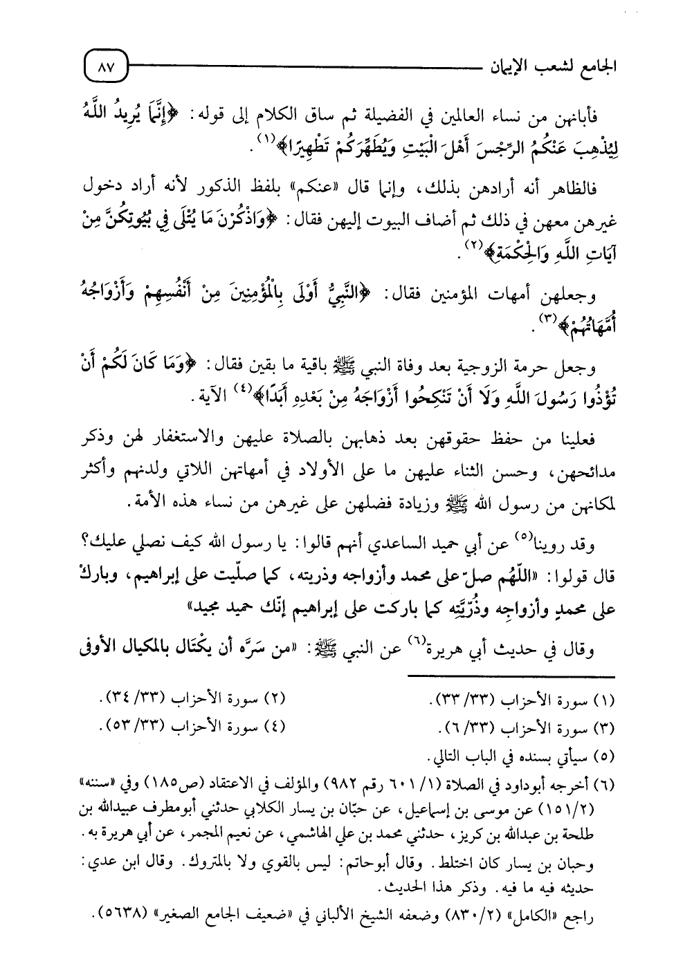وَقَالَ فِي حَدِيثِ أَبِي هُرَيْرَةَ، عَنِ النَّبِيِّ صَلَّى اللَّهُ عَلَيْهِ وَسَلَّمَ: §" مَنْ سَرَّهُ أَنْ يَكْتَالَ بِالْمِكْيَالِ الْأَوْفَى -[88]- إِذَا صَلَّى عَلَيْنَا أَهْلَ الْبَيْتِ، فَلْيَقُلِ: اللهُمَّ صَلِّ عَلَى مُحَمَّدٍ النَّبِيِّ وَأَزْوَاجِهِ أُمَّهَاتِ الْمُؤْمِنِينَ وَذُرِّيَّتِهِ كَمَا صَلَّيْتَ عَلَى إِبْرَاهِيمَ، إِنَّكَ حَمِيدٌ مَجِيدٌ " " وَقَدْ ذَكَرْنَا ذَلِكَ ومَا وَرَدَ فِي فَضْلِهِنَّ فِي كِتَابِ الْفَضَائِلِ "