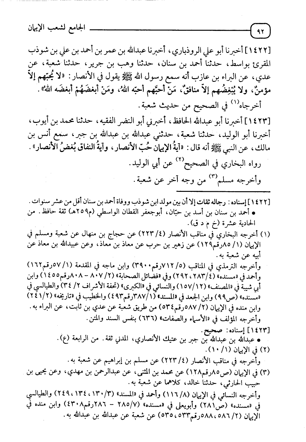 1423 - أَخْبَرَنَا أَبُو عَبْدِ اللهِ الْحَافِظُ، أَخْبَرَنِي أَبُو النَّضْرِ الْفَقِيهُ، حدثنا مُحَمَّدُ بْنُ أَيُّوبَ، أخبرنا أَبُو الْوَلِيدِ، حدثنا شُعْبَةُ، حَدَّثَنِي عَبْدُ اللهِ بْنُ عَبْدِ اللهِ بْنِ جُبَيْرٍ، سَمِعَ أَنَسُ بْنُ مَالِكٍ، عَنِ النَّبِيِّ صَلَّى اللَّهُ عَلَيْهِ وَسَلَّمَ أَنَّهُ قَالَ: " §آيَةُ الْإِيمَانِ حُبُّ الْأَنْصَارِ، وَآيَةُ النِّفَاقِ بُغْضُ الْأَنْصَارِ " رَوَاهُ الْبُخَارِيُّ فِي الصَّحِيحِ، عَنْ أَبِي الْوَلِيدِ، وَأَخْرَجَهُ مُسْلِمٌ مِنْ وَجْهٍ آخَرَ، عَنْ شُعْبَةَ