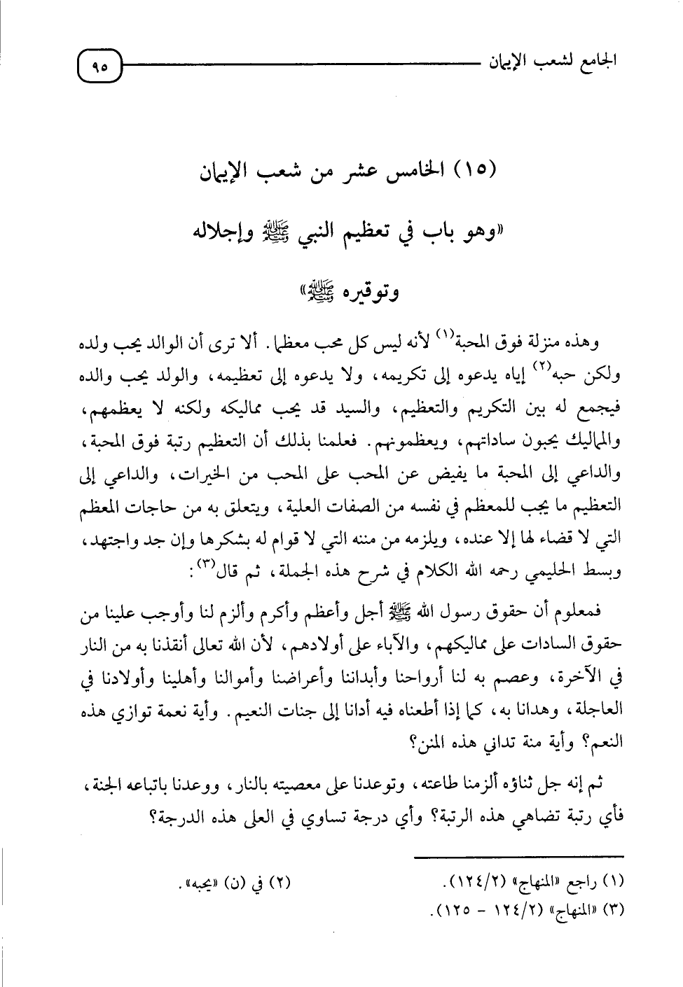 §الْخَامِسَ عَشَرَ مِنْ شُعَبِ الْإِيمَانِ وَهُوَ بَابٌ فِي تَعْظِيمِ النَّبِيِّ صَلَّى اللَّهُ عَلَيْهِ وَسَلَّمَ وَإِجْلَالِهِ وَتَوْقِيرِهِ صَلَّى اللَّهُ عَلَيْهِ وَسَلَّمَ " وَهَذِهِ مَنْزِلَةٌ فَوْقَ الْمَحَبَّةِ، لِأَنَّهُ لَيْسَ كُلُّ مُحِبٍّ مُعَظِّمًا إِلَّا أَنَّ الْوَالِدَ يُحِبُّ وَلَدَهُ، وَلَكِنَّ حُبَّهُ إِيَّاهُ يَدْعُوهُ إِلَى تَكْرِيمِهِ وَلَا يَدْعُوهُ إِلَى تَعْظِيمِهِ، وَالْوَلَدَ مُحِبٌّ وَالِدَهُ جَمَعَ لَهُ بَيْنَ التَّكْرِيمِ وَالتَّعْظِيمَ، وَالسَّيِّدَ قَدْ يُحِبُّ مَمَالِيكَهُ وَلَكِنْ لَا يُعَظِّمُهُمْ، وَالْمَمَالِيكُ يُحِبُّونَ سَادَاتِهِمْ وَيُعَظِّمُونَهْمُ، فَعَلِمْنَا بِذَلِكَ أَنَّ التَّعْظِيمَ رُتْبَةٌ فَوْقَ الْمَحَبَّةِ، وَالدَّاعِي إِلَى الْمَحَبَّةِ مَا يَفِيضُ عَنِ الْمُحِبِّ عَلَى الْمُحَبِّ مِنَ الْخَيْرَاتِ، وَالدَّاعِي إِلَى التَّعْظِيمِ مَا يُحِبُّ الْمُعَظَّمُ فِي نَفْسِهِ مِنَ الصِّفَاتِ الْعَلِيَّةِ، وَيَتَعَلَّقُ بِهِ مِنْ حَاجَاتِ الْمُعَظِّمِ الَّتِي لَا قَضَاءَ لَهَا إِلَّا عِنْدَهُ، وَيَلْزَمُهُ مِنْ سُنَّتِهِ الَّتِي لَا قِوَامَ لَهُ بِشَذِّهَا، وَإِنْ جَدَّدَ وَاجْتَهَدَ " وَبَسَطَ الْحَلِيمِيُّ رَحِمَهُ اللهُ الْكَلَامَ فِي هَذِهِ الْجُمْلَةِ، ثُمَّ قَالَ: " فَمَعْلُومٌ أَنَّ حُقُوقَ رَسُولِ اللهِ صَلَّى الله عَلَيْهِ أَجَلُّ وَأَعْظَمُ وَأَكْرَمُ وَأَلْزَمُ لَنَا وَأَوْجَبُ، عَلِمْنَا مِنْ حُقُوقِ السَّادَاتِ عَلَى مَمَالِيكِهِمْ وَالْآبَاءِ عَلَى أَوْلَادِهِمْ لِأَنَّ اللهَ تَعَالَى أَنْقَذَنَا بِهِ مِنَ النَّارِ فِي الْآخِرَةِ، وَعَصَمَ بِهِ لَنَا أَرْوَاحَنَا وَأَبْدَانَنَا وَأَعْرَاضَنَا وَأَمْوَالَنَا وَأَهْلِينَا وَأَوْلَادَنَا فِي الْعَاجِلَةِ، وَهَدَانَا لَهُ، قَالُوا: أَطَعْنَاهُ أَوَانَا إِلَى جَنَّاتِ النَّعِيمِ، فَأَيَّةُ نِعْمَةٍ تُوَازِي هَذِهِ النَّعَمَ، وَآيَةٌ مِنْهُ إِلَى هَذَا الشَّيْءِ، ثُمَّ إِنَّهِ جَلَّ ثَنَاؤُهُ أَلْزَمَنَا طَاعَتَهُ، وَتَوَعَّدَنَا عَلَى مَعْصِيَتِهِ بِالنَّارِ، وَوَعَدَنَا بِاتِّبَاعِهِ الْجَنَّةَ، فَأَيُّ رُتْبَةٍ تُضَاهِي هَذِهِ الرُّتْبَةَ، وَأَيُّ دَرَجَةٍ تُسَاوِي فِي الْعَمَلِ هَذِهِ الدَّرَجَةَ،