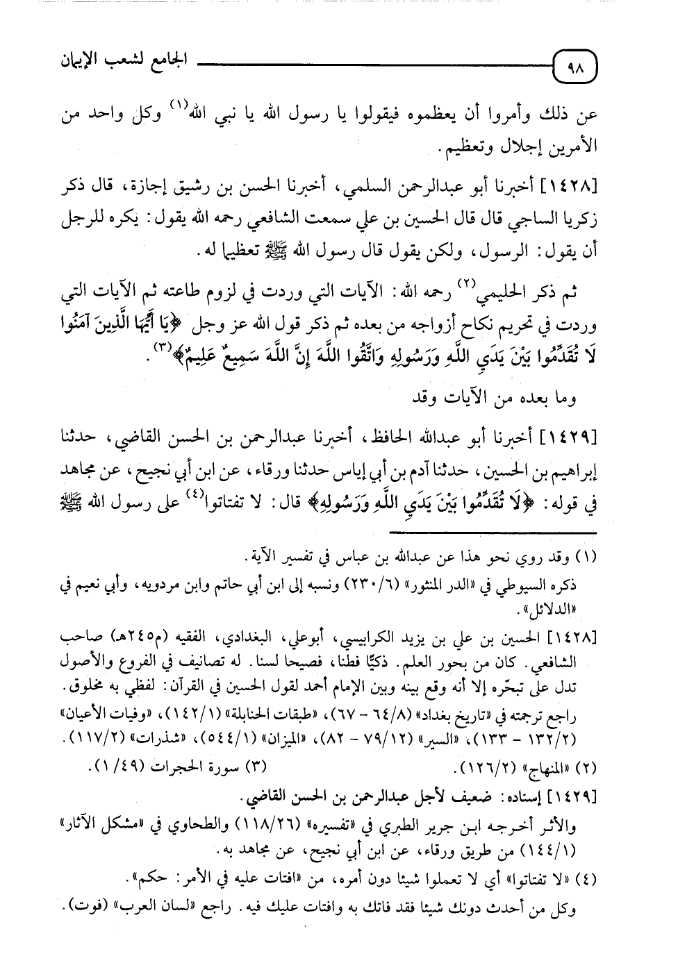 1428 - أَخْبَرَنَا أَبُو عَبْدِ الرَّحْمَنِ السُّلَمِيُّ، أخبرنا الْحَسَنُ بْنُ رَشِيقٍ إِجَازَةً، قَالَ: ذَكَرَ زَكَرِيَّا السَّاجِيُّ، قَالَ: قَالَ الْحُسَيْنُ بْنُ عَلِيٍّ: سَمِعْتُ الشَّافِعِيَّ رَحِمَهُ اللهُ يَقُولُ: " §يُكْرَهُ لِلرَّجُلِ أَنْ يَقُولَ: الرَّسُولُ، وَلَكِنْ يَقُولُ: قَالَ رَسُولُ اللهِ صَلَّى اللَّهُ عَلَيْهِ وَسَلَّمَ تَعْظِيمًا لَهُ " " ثُمَّ ذَكَرَ الْحَلِيمِيُّ رَحِمَهُ اللهُ الْآيَاتِ الَّتِي وَرَدَتْ فِي لُزُومِ طَاعَتِهِ، ثُمَّ الْآيَاتِ الَّتِي وَرَدَتْ فِي تَحْرِيمِ نِكَاحِ أَزْوَاجِهِ مِنْ بَعْدِهِ، ثُمَّ ذَكَرَ قَوْلَ اللهِ عَزَّ وَجَلَّ: {يَا أَيُّهَا الَّذِينَ آمَنُوا لَا تُقَدِّمُوا بَيْنَ يَدَيِ اللهِ وَرَسُولِهِ، وَاتَّقُوا اللهَ إِنَّ اللهَ سَمِيعٌ عَلِيمٌ} [الحجرات: 1] وَمَا بَعْدَهُ مِنَ الْآيَاتِ " وَقَدْ