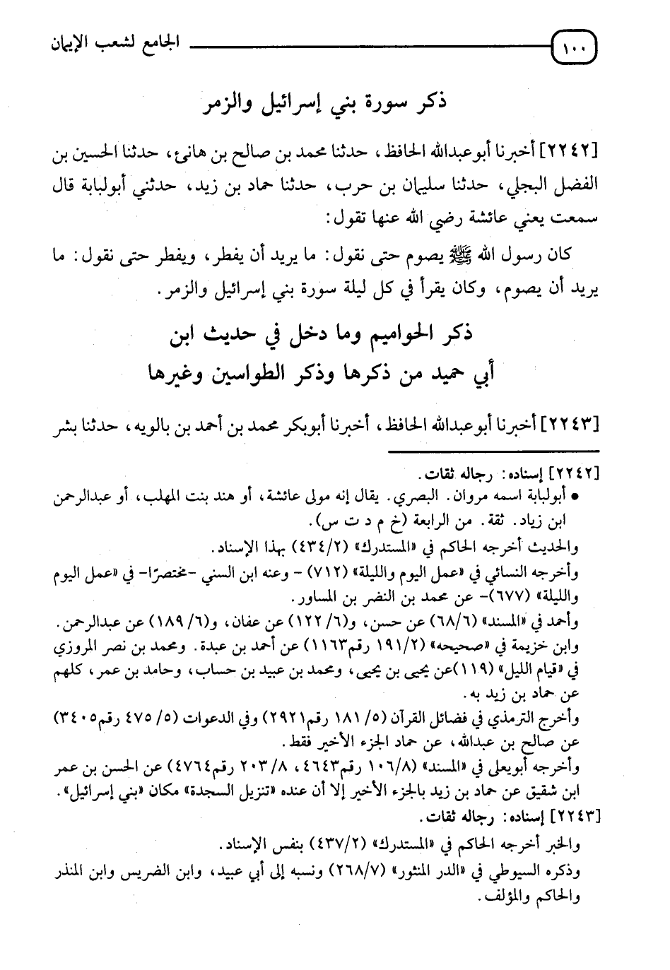2242 - أَخْبَرَنَا أَبُو عَبْدِ اللهِ الْحَافِظُ، حدثنا مُحَمَّدُ بْنُ صَالِحِ بْنِ هَانِئٍ، حدثنا الْحُسَيْنُ بْنُ الْفَضْلِ الْبَجَلِيُّ، حدثنا سُلَيْمَانُ بْنُ حَرْبٍ، حدثنا حَمَّادُ بْنُ زَيْدٍ، حَدَّثَنِي أَبُو لُبَابَةَ، قَالَ: سَمِعْتُ يَعْنِي عَائِشَةَ رَضِيَ اللهُ عَنْهَا، تَقُولُ: كَانَ رَسُولُ اللهِ صَلَّى اللَّهُ عَلَيْهِ وَسَلَّمَ " §يَصُومُ حَتَّى نَقُولَ مَا يُرِيدُ أَنْ يُفْطِرَ، وَيُفْطِرُ حَتَّى نَقُولَ مَا يُرِيدُ أَنْ يَصُومَ، وَكَانَ يَقْرَأُ فِي كُلِّ لَيْلَةٍ سُورَةَ بَنِي إِسْرَائِيلَ وَالزُّمَرَ "