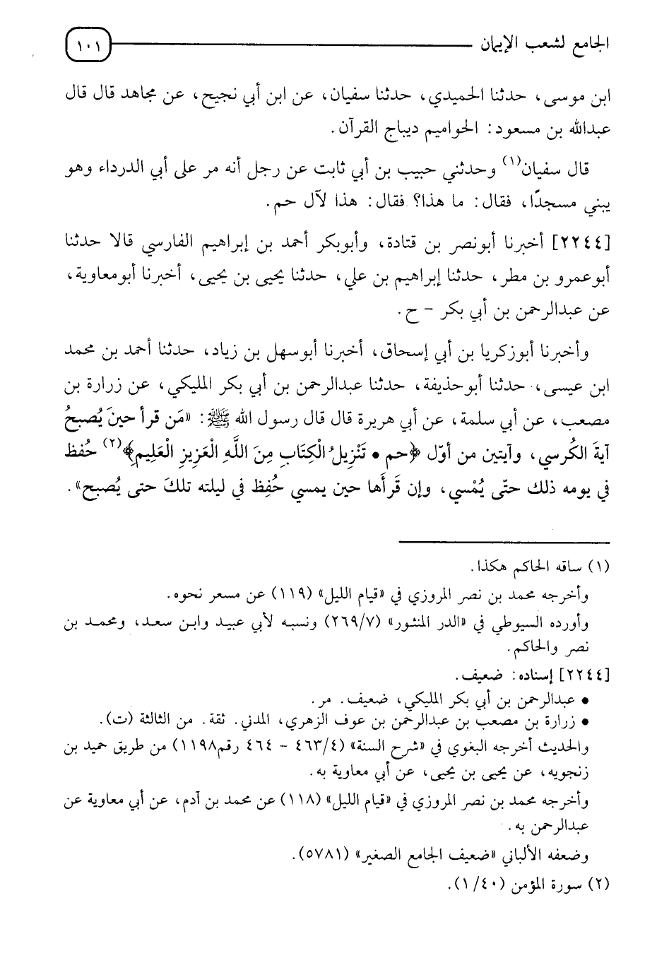 2244 - أَخْبَرَنَا أَبُو نَصْرِ بْنُ قَتَادَةَ، وَأَبُو بَكْرٍ أَحْمَدُ بْنُ إِبْرَاهِيمَ الْفَارِسِيُّ، قَالَا: حدثنا أَبُو عَمْرِو بْنُ مَطَرٍ، حدثنا إِبْرَاهِيمُ بْنُ عَلِيٍّ، حدثنا يَحْيَى بْنُ يَحْيَى، أَخْبَرَنا أبو مُعَاوِيَةُ، عَنْ عَبْدِ الرَّحْمَنِ بْنِ أَبِي بَكْرٍ، ح وَأَخْبَرَنَا أَبُو زَكَرِيَّا بْنُ أَبِي إِسْحَاقَ، أَخْبَرَنا أَبُو سَهْلِ بْنُ زِيَادٍ، حدثنا أَحْمَدُ بْنُ مُحَمَّدِ بْنِ عِيسَى، حدثنا أَبُو حُذَيْفَةَ، حدثنا عَبْدُ الرَّحْمَنِ بْنُ أَبِي بَكْرٍ الْمُلَيْكِيُّ، عَنْ زُرَارَةَ بْنِ مُصْعَبٍ، عَنْ أَبِي سَلَمَةَ، عَنْ أَبِي هُرَيْرَةَ، قَالَ: قَالَ رَسُولُ اللهِ صَلَّى اللَّهُ عَلَيْهِ وَسَلَّمَ: §" مَنْ قَرَأَ حِينَ يُصْبِحُ آيَةَ الْكُرْسِيِّ وَآيَتَيْنِ مِنْ أَوَّلِ حم تَنْزِيلُ الْكِتَابِ مِنَ اللهِ الْعَزِيزِ الْعَلِيمِ حُفِظَ فِي يَوْمِهِ ذَلِكَ حَتَّى يُمْسِيَ، وَإِنْ قَرَأَهَا حِينَ يُمْسِي حُفِظَ في لَيْلَتِهِ تِلْكَ حَتَّى يُصْبِحَ "