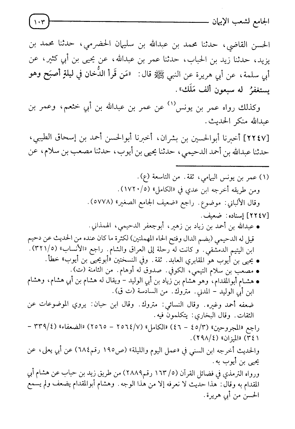 2247 - أَخْبَرَنَا أَبُو الْحُسَيْنِ بْنُ بِشْرَانَ، أَخْبَرَنا أَبُو الْحَسَنِ أَحْمَدُ بْنُ إِسْحَاقَ الطَّيِّبِيُّ، حدثنا عَبْدُ اللهِ بْنُ أَحْمَدَ الدُّحَيْمِيُّ، حدثنا يَحْيَى بْنُ أَيُّوبَ، حدثنا مُصْعَبُ بْنُ سَلَّامٍ، عَنْ -[104]- هِشَامِ بْنِ أَبِي الْمِقْدَامِ، عَنِ الْحَسَنِ، عَنْ أَبِي هُرَيْرَةَ، قَالَ: قَالَ رَسُولُ اللهِ صَلَّى اللَّهُ عَلَيْهِ وَسَلَّمَ: §" مَنْ قَرَأَ سُورَةَ الدُّخَانِ فِي لَيْلَةِ جُمُعَةٍ أَصْبَحَ مَغْفُورًا لَهُ "
