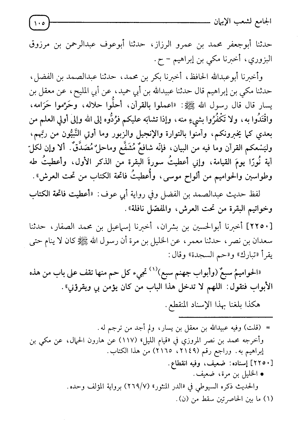 2250 - أَخْبَرَنَا أَبُو الْحُسَيْنِ بْنُ بِشْرَانَ، أَخْبَرَنا إِسْمَاعِيلُ بْنُ مُحَمَّدٍ الصَّفَّارُ، حدثنا سَعْدَانُ بْنُ نَصْرٍ، حدثنا مَعْمَرٌ، عَنِ الْخَلِيلِ بْنِ مُرَّةَ، أَنَّ رَسُولَ اللهِ صَلَّى اللَّهُ عَلَيْهِ وَسَلَّمَ كَانَ §لَا يَنَامُ حَتَّى يَقْرَأَ تَبَارَكَ، وَحم السَّجْدَةِ وَقَالَ: " الْحَوَامِيمُ سَبْعٌ، وَأَبْوَابُ جَهَنَّمَ سَبْعٌ تَجِيءُ كُلُّ حم مِنْهَا تَقِفُ عَلَى بَابٍ مِنْ هَذِهِ الْأَبْوَابِ فَتَقُولُ: اللهُمَّ لَا تُدْخِلُ مِنْ هَذَا الْبَابِ مَنْ كَانَ يُؤْمِنُ بِي وَيَقْرَؤُنِي " هَكَذَا بَلَغَنَا بِهَذَا الْإِسْنَادِ الْمُنْقَطِعِ