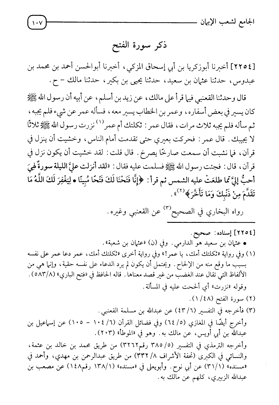 2254 - أَخْبَرَنَا أَبُو زَكَرِيَّا بْنُ أَبِي إِسْحَاقَ الْمُزَكِي، أَخْبَرَنا أَبُو الْحَسَنِ أَحْمَدُ بْنُ مُحَمَّدِ بْنِ عُبْدُوسٍ، حدثنا عُثْمَانُ بْنُ سَعِيدٍ، حدثنا يَحْيَى بْنُ بُكَيْرٍ، حدثنا مَالِكٌ، ح قَالَ: وَحدثنا الْقَعْنَبِيُّ، فِيمَا قَرَأَ عَلَى مَالِكٍ، عَنْ زَيْدِ بْنِ أَسْلَمَ، عَنْ أَبِيهِ، أَنَّ رَسُولَ اللهِ صَلَّى اللَّهُ عَلَيْهِ وَسَلَّمَ كَانَ يَسِيرُ فِي بَعْضِ أَسْفَارِهِ وَعُمَرُ بْنُ الْخَطَّابِ يَسِيرُ مَعَهُ فَسَأَلَهُ عُمَرُ عَنْ شَيْءٍ، فَلَمْ يُجِبْهُ، ثُمَّ سَأَلَهُ، فَلَمْ يُجِبْهُ ثَلَاثَ مَرَّاتٍ، فَقَالَ عُمَرُ: ثَكِلَتْكَ أُمُّكَ يَا عُمَرُ، نَزَرْتَ رَسُولَ اللهِ صَلَّى اللَّهُ عَلَيْهِ وَسَلَّمَ ثَلَاثًا لَا يُجِيبُكَ، قَالَ عُمَرُ: فَحَرَّكْتُ بَعِيرِي حَتَّى تَقَدَّمْتُ أَمَامَ النَّاسِ، وَخَشِيتُ أَنْ يَنْزِلَ فِيَّ قُرْآنٌ فَمَا نَشِبْتُ أَنْ سَمِعْتُ صَارِخًا يَصْرُخُ، قَالَ: قُلْتُ: لَقَدْ خَشِيتُ أَنْ يَكُونَ نَزَلَ فِيَّ قُرْآنٌ، قَالَ: فَجِئْتُ رَسُولَ اللهِ صَلَّى اللَّهُ عَلَيْهِ وَسَلَّمَ فَسَلَّمْتُ عَلَيْهِ فَقَالَ: §" لَقَدْ أُنْزِلَتْ عَلَيَّ اللَّيْلَةَ سُورَةٌ لَهِيَ أَحَبُّ إِلَيَّ مِمَّا طَلَعَتْ عَلَيْهِ الشَّمْسُ " ثُمَّ قَرَأَ: {إِنَّا فَتَحْنَا لَكَ فَتْحًا مُبِينًا لِيَغْفِرَ لَكَ اللهُ مَا تَقَدَّمَ مِنْ ذَنْبِكَ وَمَا تَأَخَّرَ} [الفتح: 2] رَوَاهُ الْبُخَارِيُّ فِي الصَّحِيحِ، عَنِ الْقَعْنَبِيِّ وَغَيْرِهِ