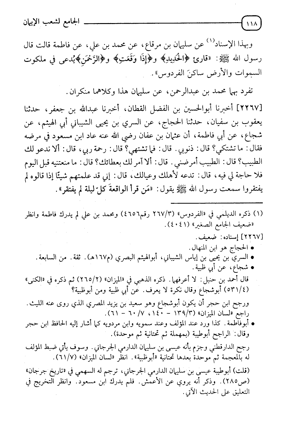 2267 - أَخْبَرَنَا أَبُو الْحُسَيْنِ بْنُ الْفَضْلِ الْقَطَّانُ، أَخْبَرَنا عَبْدُ اللهِ بْنُ جَعْفَرٍ، حدثنا يَعْقُوبُ بْنُ سُفْيَانَ، حَدَّثَنَا الْحَجَّاجُ، عَنِ السَّرِيِّ بْنِ يَحْيَى الشَّيْبَانِيِّ أَبِي الْهَيْثَمِ، عَنْ شُجَاعٍ، عَنْ أَبِي فَاطِمَةَ، أَنَّ عُثْمَانَ بْنَ عَفَّانَ رَضِيَ اللهُ عَنْهُ، عَادَ ابْنَ مَسْعُودٍ فِي مَرَضِهِ، فَقَالَ: مَا تَشْتَكِي؟ قَالَ: ذُنُوبِي، قَالَ: فَمَا تَشْتَهِي؟ قَالَ: رَحْمَةَ رَبِّي، قَالَ: أَلَا نَدْعُو لَكَ الطَّبِيبَ؟ قَالَ: الطَّبِيبُ أَمْرَضَنِي، قَالَ: أَلَا آمُرُ لَكَ بِعَطَائِكَ؟ قَالَ: ما مَنَعْتَنِيهِ قَبْلَ الْيَوْمِ فَلَا حَاجَةَ لِي فِيهِ، قَالَ: تَدَعْهُ لَأَهْلِكَ وَعِيَالِكَ، قَالَ: إِنِّي قَدْ عَلَّمْتُهُمْ شَيْئًا إِذَا قَالُوهُ لَمْ يَفْتَقِرُوا، سَمِعْتُ رَسُولَ اللهِ صَلَّى اللَّهُ عَلَيْهِ وَسَلَّمَ يَقُولُ: " §مَنْ قَرَأَ الْوَاقِعَةَ كُلَّ لَيْلَةٍ لَمْ يَفْتَقِرْ " " -[119]- تَفَرَّدَ بِهِ شُجَاعٌ بن عطية هَذَا "، وَرَوَاهُ ابْنُ وَهْبٍ عَنِ السَّرِيِّ بْنِ يَحْيَى، أَنَّ شُجَاعًا، حَدَّثَهُ عَنْ أَبِي ظَبْيَةَ، عَنْ عَبْدِ اللهِ بْنِ مَسْعُودٍ، عَنِ النَّبِيِّ صَلَّى اللَّهُ عَلَيْهِ وَسَلَّمَ