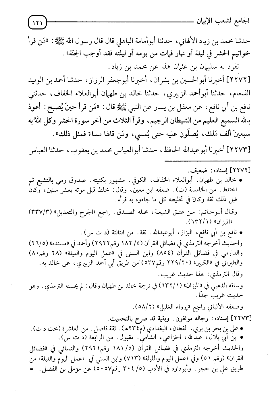 2272 - أَخْبَرَنَا أَبُو الْحُسَيْنِ بْنُ بِشْرَانَ، أَخْبَرَنا أَبُو جَعْفَرٍ الرَّزَّازُ، حدثنا أَحْمَدُ بْنُ الْوَلِيدِ الْفَحَّامُ، حدثنا أَبُو أَحْمَدَ الزُّبَيْرِيُّ، حدثنا خَالِدُ بْنُ طَهْمَانَ أَبُو الْعَلَاءِ الْخَفَّافُ، حَدَّثَنِي نَافِعُ بْنُ أَبِي نَافِعٍ، عَنْ مَعْقِلِ بْنِ يَسَارٍ، عَنِ النَّبِيِّ صَلَّى اللَّهُ عَلَيْهِ وَسَلَّمَ قَالَ: " مَنْ قرأ حِينَ يُصْبِحُ: §أَعُوذُ بِاللهِ السَّمِيعِ الْعَلِيمِ مِنَ الشَّيْطَانِ الرَّجِيمِ، وَقَرَأَ الثَّلَاثَ مِنْ آخِرِ سُورَةِ الْحَشْرِ وَكَّلَ اللهُ بِهِ سَبْعِينَ أَلْفَ مَلَكٍ يُصَلُّونَ عَلَيْهِ حَتَّى يُمْسِيَ، وَمَنْ قَالَهَا مَسَاءً فَمِثْلُ ذَلِكَ "