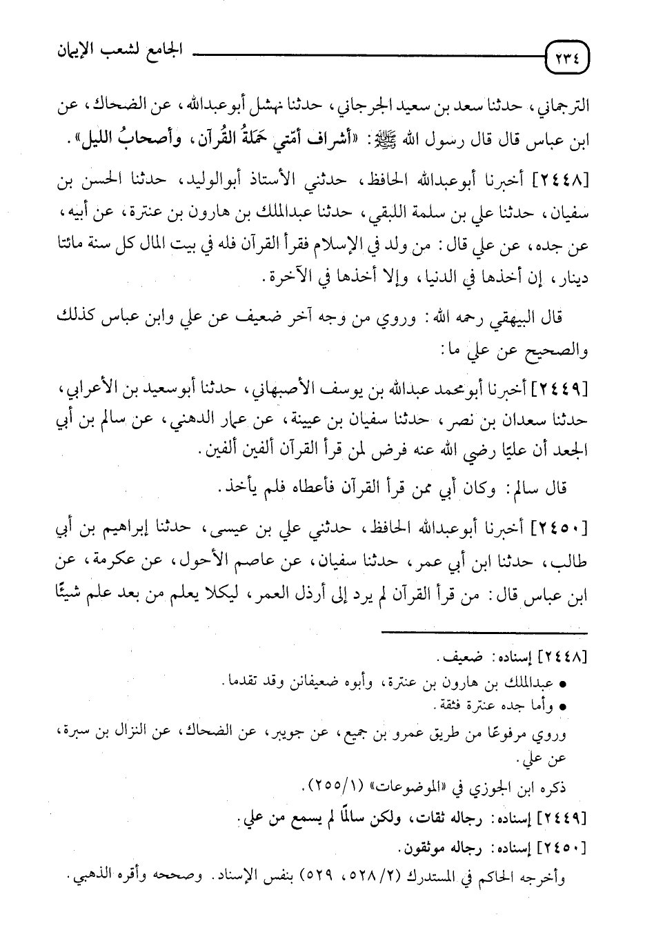 2448 - أَخْبَرَنَا أَبُو عَبْدِ اللهِ الْحَافِظُ، حَدَّثَنِي الْأُسْتَاذُ أَبُو الْوَلِيدِ، حدثنا الْحَسَنُ بْنُ سُفْيَانَ، حدثنا عَلِيُّ بْنُ سَلَمَةَ اللَّبَقِيُّ، حدثنا عَبْدُ الْمَلِكِ بْنُ هَارُونَ بْنِ عَنْتَرَةَ، عَنْ أَبِيهِ، عَنْ جَدِّهِ، عَنْ عَلِيٍّ، قَالَ: §" مَنْ وُلِدَ فِي الْإِسْلَامِ فَقَرَأَ الْقُرْآنَ فَلَهُ فِي بَيْتِ الْمَالِ كُلَّ سَنَةٍ مِائَتَا دِينَارٍ إِنْ أَخَذَهَا فِي الدُّنْيَا وَإِلَّا أَخَذَهَا فِي الْآخِرَةِ " قَالَ الْبَيْهَقِيُّ رَحِمَهُ اللهُ: " وَرُوِيَ مِنْ وَجْهٍ آخَرَ ضَعِيفٍ، عَنْ عَلِيٍّ، وَابْنِ عَبَّاسٍ كَذَلِكَ، وَالصَّحِيحُ عَنْ عَلِيٍّ مَا "