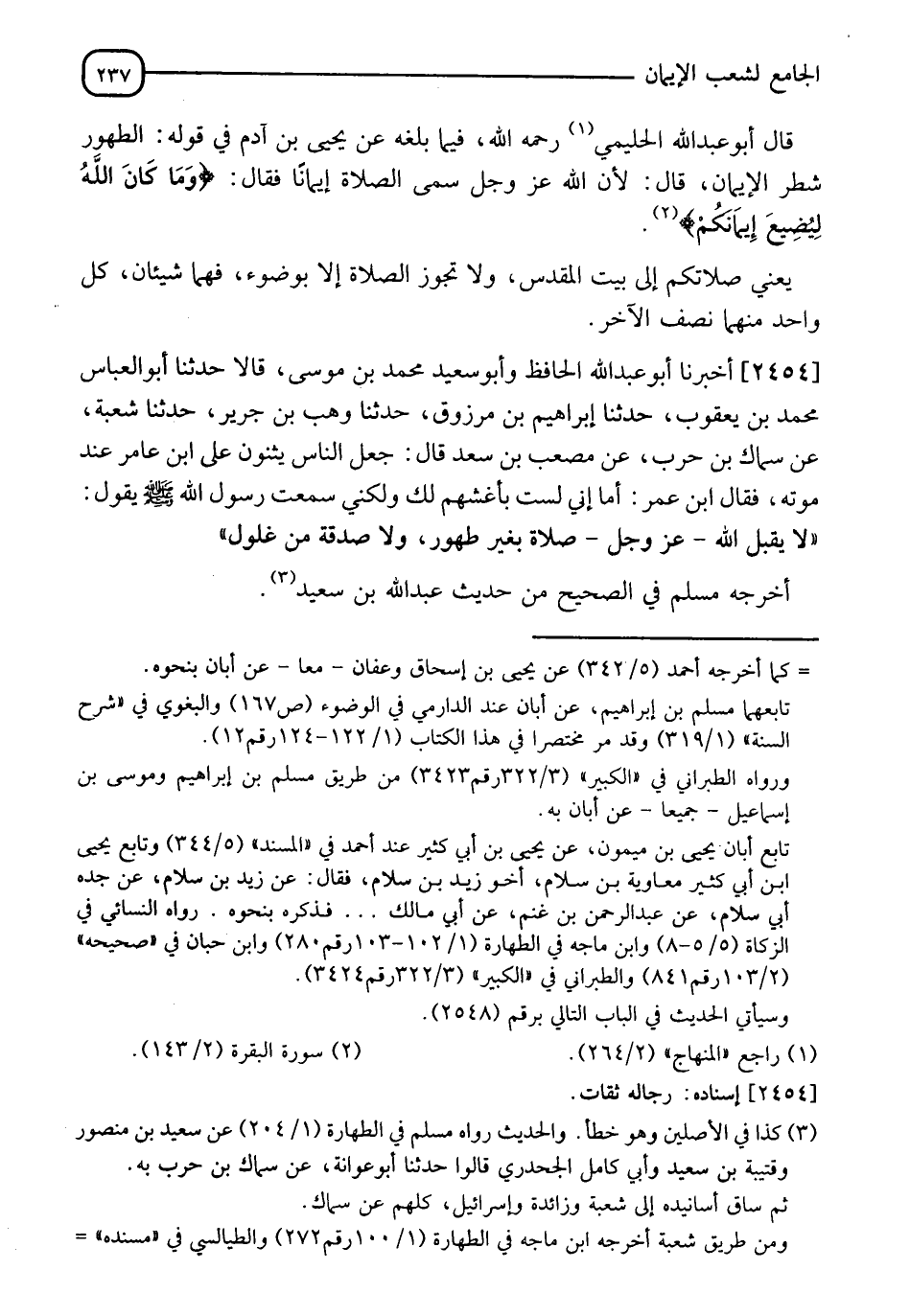 2454 - أَخْبَرَنَا أَبُو عَبْدِ اللهِ الْحَافِظُ، وَأَبُو سَعِيدٍ مُحَمَّدُ بْنُ مُوسَى، قَالَا: حدثنا أَبُو الْعَبَّاسِ مُحَمَّدُ بْنُ يَعْقُوبَ، حدثنا إِبْرَاهِيمُ بْنُ مَرْزُوقٍ، حدثنا وَهْبُ بْنُ جَرِيرٍ، حدثنا شُعْبَةُ، عَنْ سِمَاكِ بْنِ حَرْبٍ، عَنْ مُصْعَبِ بْنِ سَعْدٍ، قَالَ: جَعَلَ النَّاسُ يُثْنُونَ عَلَى ابْنِ عَامِرٍ عِنْدَ مَوْتِهِ فَقَالَ ابْنُ عُمَرَ: أَمَا إِنِّي لَسْتُ بِأَغَشِّهِمْ لَكَ، وَلَكِنِّي سَمِعْتُ رَسُولَ اللهِ صَلَّى اللَّهُ عَلَيْهِ وَسَلَّمَ يَقُولُ: §" لَا يَقْبَلُ اللهُ عَزَّ وَجَلَّ صَلَاةً بِغَيْرِ طُهُورٍ، وَلَا صَدَقَةً مِنْ غُلُولٍ " أَخْرَجَهُ مُسْلِمٌ فِي الصَّحِيحِ مِنْ حَدِيثِ عَبْدِ اللهِ بْنِ سَعِيدٍ