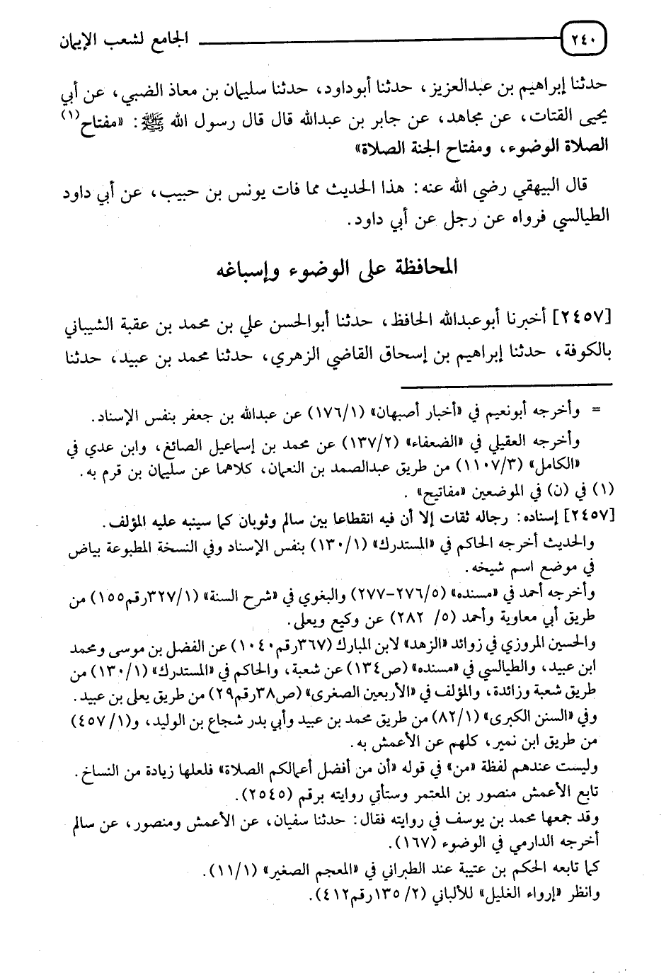 2457 - أَخْبَرَنَا أَبُو عَبْدِ اللهِ الْحَافِظُ، حدثنا أَبُو الْحَسَنِ عَلِيُّ بْنُ مُحَمَّدِ بْنِ عُقْبَةَ الشَّيْبَانِيُّ، بِالْكُوفَةِ حدثنا إِبْرَاهِيمُ بْنُ إِسْحَاقَ الْقَاضِي الزُّهْرِيُّ، حدثنا مُحَمَّدُ بْنُ عُبَيْدٍ، حدثنا -[241]- الْأَعْمَشُ، عَنْ سَالِمِ بْنِ أَبِي الْجَعْدِ، عَنْ ثَوْبَانَ، قَالَ: قَالَ رَسُولُ اللهِ صَلَّى اللَّهُ عَلَيْهِ وَسَلَّمَ: §" اسْتَقِيمُوا وَلَنْ تُحْصُوا، وَاعْلَمُوا أَنَّ مِنْ أَفْضَلِ أَعْمَالِكُمُ الصَّلَاةَ، وَلَنْ يُحَافِظَ عَلَى الْوُضُوءِ إِلَّا مُؤْمِنٌ "
