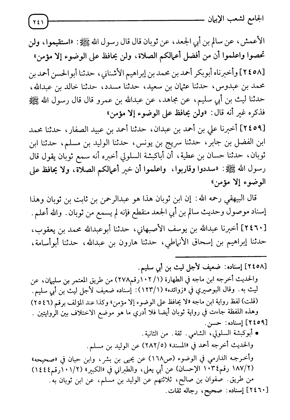 2459 - أَخْبَرَنَا عَلِيُّ بْنُ أَحْمَدَ بْنِ عَبْدَانَ، حدثنا أَحْمَدُ بْنُ عُبَيْدٍ الصَّفَّارُ، حدثنا مُحَمَّدُ بْنُ الْفَضْلِ بْنِ جَابِرٍ، حدثنا سُرَيْجُ بْنُ يُونُسَ، حدثنا الْوَلِيدُ بْنُ مُسْلِمٍ، حدثنا ابْنُ ثَوْبَانَ، حدثنا حَسَّانُ بْنُ عَطِيَّةَ، أَنَّ أَبَا كَبْشَةَ السَّلُولِيَّ، أَخْبَرَهُ، أَنَّهُ سَمِعَ ثَوْبَانَ، يَقُولُ: قَالَ رَسُولُ اللهِ صَلَّى اللَّهُ عَلَيْهِ وَسَلَّمَ: " §سَدِّدُوا، وَقَارِبُوا، وَاعْلَمُوا أَنَّ خَيْرَ أَعْمَالِكُمُ الصَّلَاةُ، وَلَا يُحَافِظُ عَلَى الْوُضُوءِ إِلَّا مُؤْمِنٌ " قَالَ الْبَيْهَقِيُّ رَحِمَهُ اللهُ: " أن ابْنُ ثَوْبَانَ هَذَا هُوَ عَبْدُ الرَّحْمَنِ بْنُ ثَابِتِ بْنِ ثَوْبَانَ، وَهَذَا إِسْنَادٌ مَوْصُولٌ، وَحَدِيثُ سَالِمِ بْنِ أَبِي الْجَعْدِ مُنْقَطِعٌ، فَإِنَّهُ لَمْ يَسْمَعْ مِنْ ثَوْبَانَ وَاللهُ أَعْلَمُ "