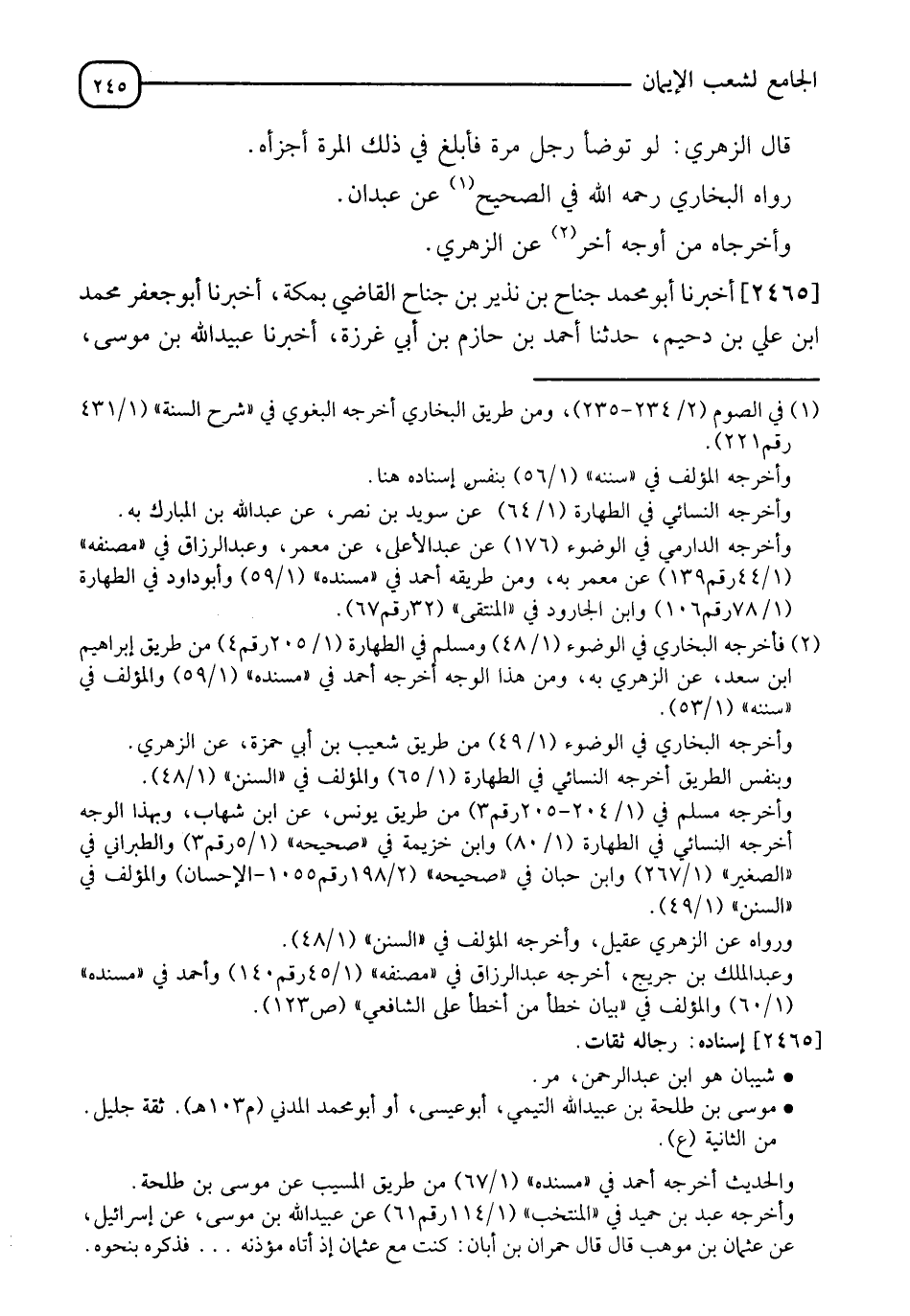 2465 - أَخْبَرَنَا أَبُو مُحَمَّدٍ جُنَاحُ بْنُ نَذِيرِ بْنِ جُنَاحٍ الْقَاضِي بِمَكَّةَ، أَخْبَرَنا أَبُو جَعْفَرٍ مُحَمَّدُ بْنُ عَلِيِّ بْنِ دُحَيْمٍ، حدثنا أَحْمَدُ بْنُ حَازِمِ بْنِ أَبِي غَرَزَةَ، أَخْبَرَنا عُبَيْدُ اللهِ بْنُ مُوسَى، -[246]- أَخْبَرَنا شَيْبَانُ، عَنْ عَبْدِ الْمَلِكِ بْنِ عُمَيْرٍ، عَنْ مُوسَى بْنِ طَلْحَةَ، عَنْ حُمْرَانَ بْنِ أَبَانَ، قَالَ: إِنِّي لَجَالِسٌ مَعَ عُثْمَانَ بْنِ عَفَّانَ إِذْ أَذَّنَ الْمُؤَذِّنُ، ثُمَّ أَتَاهُ لِيُعَلِّمَهُ قَالَ: فَدَعَا عُثْمَانُ بِطَهُورٍ، ثُمَّ قَالَ: لَقَدْ أَرَدْتُ أَنْ أُحَدِّثَكُمْ حَدِيثًا، ثُمَّ بَدَا لِي أَلَّا أَفْعَلُ، فَقَالَ لَهُ الْحَكَمُ بْنُ أَبِي الْعَاصِ: حَدِّثْنَا يَا أَمِيرَ الْمُؤْمِنِينَ فَإِنْ يَكُ خَيْرًا نُسَارِعُ فِيهِ، وَإمَّا غَيْرُ ذَلِكَ فَنَكُفَّ عَنْهُ فَقَالَ: كُنْتُ جَالِسًا مَعَ رَسُولِ اللهِ صَلَّى اللَّهُ عَلَيْهِ وَسَلَّمَ ذَاتَ يَوْمٍ فَأَتَاهُ الْمُؤَذِّنُ يُؤْذِنُهُ كَمَا أَتَانِي لِيُؤْذِنُنِي، فَدَعَا بِطَهُورٍ ثُمَّ قَالَ: " §مَا مِنْ رَجُلٍ مُسْلِمٍ يَتَطَهَّرُ فَيُحْسِنُ الطُّهُورَ، ثُمَّ يَقُومُ إِلَى الصَّلَاةِ إِلَّا كَانَتْ صَلَاتُهُ تِلْكَ كَفَّارَةٌ لِمَا قَبْلَهَا مِنَ الْخَطَايَا "