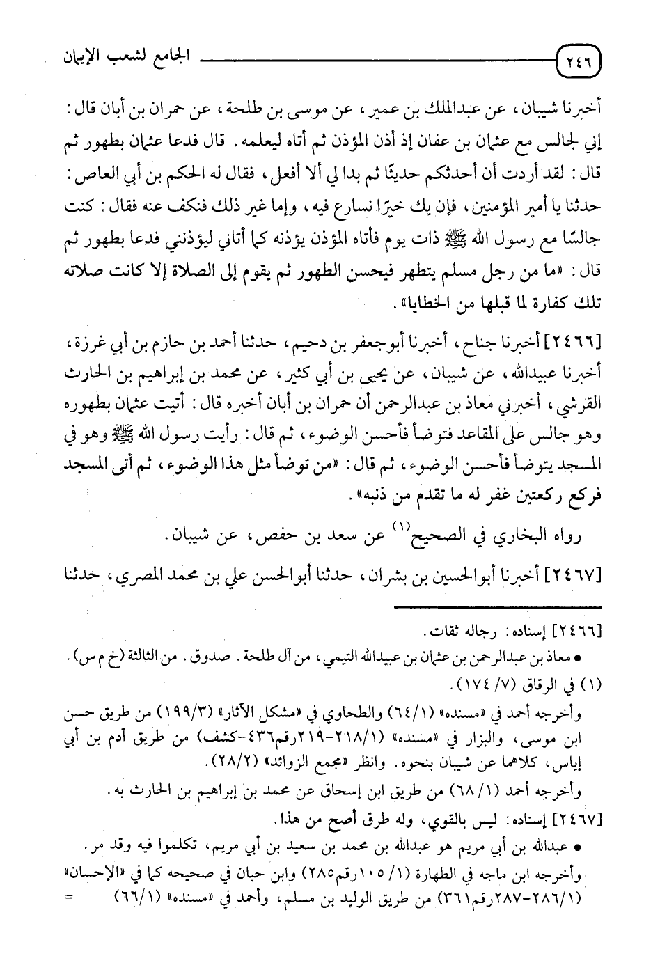 2466 - أَخْبَرَنَا جُنَاحٌ، أَخْبَرَنا أَبُو جَعْفَرِ بْنِ دُحَيْمٍ، حدثنا أَحْمَدُ بْنُ حَازِمِ بْنِ أَبِي غَرَزَةَ، أَخْبَرَنا عُبَيْدُ اللهِ، عَنْ شَيْبَانَ، عَنْ يَحْيَى بْنِ أَبِي كَثِيرٍ، عَنْ مُحَمَّدِ بْنِ إِبْرَاهِيمَ بْنِ الْحَارِثِ الْقُرَشِيِّ، أَخْبَرَنِي مُعَاذُ بْنُ عَبْدِ الرَّحْمَنِ، أَنَّ حُمْرَانَ بْنَ أَبَانَ، أَخْبَرَهُ قَالَ: أَتَيْتُ عُثْمَانَ بِطَهُورِهِ وَهُوَ جَالِسٌ عَلَى الْمَقَاعِدِ فَتَوَضَّأَ فَأَحْسَنَ الْوُضُوءَ، ثُمَّ قَالَ: رَأَيْتُ رَسُولَ اللهِ صَلَّى اللَّهُ عَلَيْهِ وَسَلَّمَ وَهُوَ فِي الْمَسْجِدِ يتَوَضَّأُ فَأَحْسَنَ الْوُضُوءَ ثُمَّ قَالَ: §" مَنْ تَوَضَّأَ مِثْلَ هَذَا الْوُضُوءِ ثُمَّ أَتَى الْمَسْجِدَ فَرَكَعَ رَكْعَتَيْنِ غُفِرَ لَهُ مَا تَقَدَّمَ مِنْ ذَنْبِهِ " رَوَاهُ الْبُخَارِيُّ فِي الصَّحِيحِ عَنْ سَعْدِ بْنِ حَفْصٍ، عَنْ شَيْبَانَ
