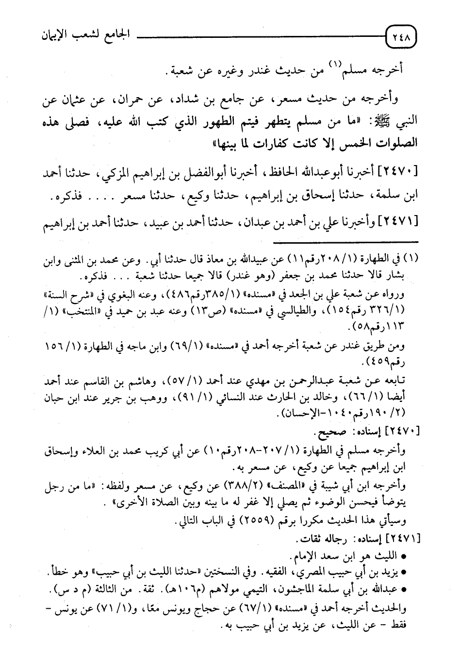 2471 - وَأَخْبَرَنا عَلِيُّ بْنُ أَحْمَدَ بْنِ عَبْدَانَ، حدثنا أَحْمَدُ بْنُ عُبَيْدٍ، حدثنا أَحْمَدُ بْنُ إِبْرَاهِيمَ -[249]- بْنِ مِلْحَانَ، حدثنا يَحْيَى بْنُ بُكَيْرٍ، حدثنا اللَّيْثُ، عَنِ يَزِيدَ بْنِ أَبِي حَبِيبٍ، عَنْ عَبْدِ اللهِ بْنِ أَبِي سَلَمَةَ، وَنَافِعِ بْنِ جُبَيْرِ بْنِ مُطْعِمٍ، عَنْ مُعَاذِ بْنِ عَبْدِ الرَّحْمَنِ، عَنْ حُمْرَانَ، مَوْلَى عُثْمَانَ بْنِ عَفَّانَ عَنْ عُثْمَانَ بْنِ عَفَّانَ أَنَّهُ قَالَ: سَمِعْتُ رَسُولَ اللهِ صَلَّى اللَّهُ عَلَيْهِ وَسَلَّمَ يَقُولُ: §" مَنْ تَوَضَّأَ فَأَسْبَغَ الْوُضُوءَ ثُمَّ خَرَجَ يَمْشِي إِلَى الصَّلَاةِ الْمَكْتُوبَةِ فَصَلَّاهَا مَعَ الْإِمَامِ غُفِرَ لَهُ ذَنْبُهُ " قَالَ الْبَيْهَقِيُّ رَضِيَ اللهُ عَنْهُ: " وَكَذَلِكَ رَوَاهُ عَمْرُو بْنُ الْحَارِثِ، عَنِ الْحَكِيمِ بْنِ عَبْدِ اللهِ الْقُرَشِيِّ عَنْهُمَا "، وَمِنْ ذَلِكَ الْوَجْهِ أَخْرَجَهُ مُسْلِمٌ فِي الصَّحِيحِ