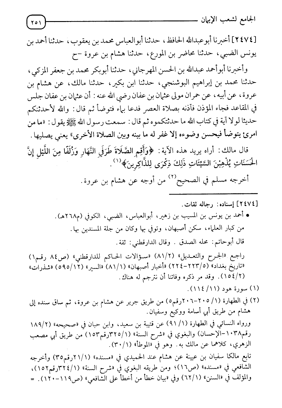 2474 - أَخْبَرَنَا أَبُو عَبْدِ اللهِ الْحَافِظُ، حدثنا أَبُو الْعَبَّاسِ مُحَمَّدُ بْنُ يَعْقُوبَ، حدثنا أَحْمَدُ بْنُ يُونُسَ الضَّبِّيُّ، حدثنا مُحَاضِرُ بْنُ الْمُوْرِعِ، حدثنا هِشَامُ بْنُ عُرْوَةَ، ح وَأَخْبَرَنَا أَبُو أَحْمَدَ عَبْدُ اللهِ بْنُ الْحَسَنِ الْمِهْرَجَانِيُّ، حدثنا أَبُو بَكْرٍ مُحَمَّدُ بْنُ جَعْفَرٍ الْمُزَكِّي، حدثنا مُحَمَّدُ بْنُ إِبْرَاهِيمَ الْبُوشَنْجِيُّ، حدثنا ابْنُ بُكَيْرٍ، حدثنا مَالِكٌ، عَنْ هِشَامِ بْنِ عُرْوَةَ، عَنْ أَبِيهِ، عَنْ حُمْرَانَ، مَوْلَى عُثْمَانَ بْنِ عَفَّانَ رَضِيَ اللهُ عَنْهُ، أَنَّ عُثْمَانَ بْنَ عَفَّانَ جَلَسَ عَلَى الْمَقَاعِدِ، فَجَاءَ الْمُؤَذِّنُ فَآذَنَهُ بِصَلَاةِ الْعَصْرِ، فَدَعَا بِمَاءٍ فَتَوَضَّأَ، ثُمَّ قَالَ: وَاللهِ لَأُحَدِّثَنَّكُمْ حَدِيثًا لَوْلَا آيَّةٌ فِي كِتَابِ اللهِ مَا حَدَّثْتُكُمُوهُ، ثُمَّ قَالَ: سَمِعْتُ رَسُولَ اللهِ صَلَّى اللَّهُ عَلَيْهِ وَسَلَّمَ يَقُولُ: " §مَا مِنِ امْرِئٍ يَتَوَضَّأُ فَيُحْسِنُ وُضُوءَهُ، إِلَّا غُفِرَ لَهُ مَا بَيْنَهُ وَبَيْنَ الصَّلَاةِ الْأُخْرَى يعني يُصَلِّيَهَا " قال مَالِكٌ " أُرَاهُ يُرِيدُ هَذِهِ الْآيَةَ ": {وأَقِمِ الصَّلَاةَ طَرَفَيِ النَّهَارِ وَزُلَفًا مِنَ اللَّيْلِ إِنَّ الْحَسَنَاتِ يُذْهِبْنَ السَّيِّئَاتِ ذَلِكَ ذِكْرَى لِلذَّاكِرِينَ} [هود: 114] أَخْرَجَهُ مُسْلِمٌ فِي الصَّحِيحِ مِنْ أَوْجُهٍ، عَنْ هِشَامِ بْنِ عُرْوَةَ، -[252]- وَقَدْ رَوَاهُ الزُّهْرِيُّ، عَنْ عُرْوَةَ، وَقَالَ قال عُرْوَةُ: الْآيَةُ {إِنَّ الَّذِينَ يَكْتُمُونَ مَا أَنْزَلنا مِنَ الْبينَاتِ} [البقرة: 159]
