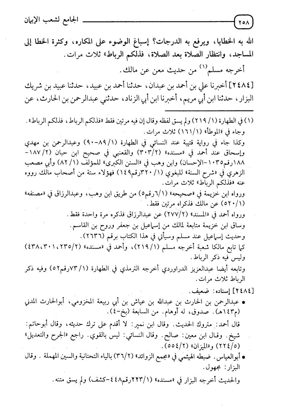 2484 - أَخْبَرَنَا عَلِيُّ بْنُ أَحْمَدَ بْنِ عَبْدَانَ، حَدَّثَنَا أَحْمَدُ بْنُ عُبَيْدٍ، حَدَّثَنَا عُبَيْدُ بْنُ شَرِيكٍ الْبَزَّارُ، حَدَّثَنَا ابْنُ أَبِي مَرْيَمَ، أَخْبَرَنا ابْنُ أَبِي الزِّنَادِ، حَدَّثَنِي عَبْدُ الرَّحْمَنِ بْنُ الْحَارِثِ، عَنْ -[259]- أَبِي الْعَبَّاسِ، عَنِ ابْنِ الْمُسَيِّبِ، عَنْ عَلِيِّ بْنِ أَبِي طَالِبٍ، قَالَ: قَالَ رَسُولُ اللهِ صَلَّى اللَّهُ عَلَيْهِ وَسَلَّمَ: " §إِسْبَاغُ الْوُضُوءِ عَلَى الْمَكَارِهِ، وَإِعْمَالُ الْأَقْدَامِ إِلَى الْمَسَاجِدِ، وَانْتِظَارُ الصَّلَاةِ بَعْدَ الصَّلَاةِ، تَغْسِلُ الْخَطَايَا غَسْلًا " " عَبْدُ الرَّحْمَنِ بْنُ الْحَارِثِ، هَذَا هُوَ ابن عَبْدِ اللهِ بْنُ عَيَّاشِ بْنِ أَبِي رَبِيعَةَ الْمَخْزُومِيُّ، فِيمَا زَعَمَ أَبُو أَحْمَدَ الْحَافِظُ "